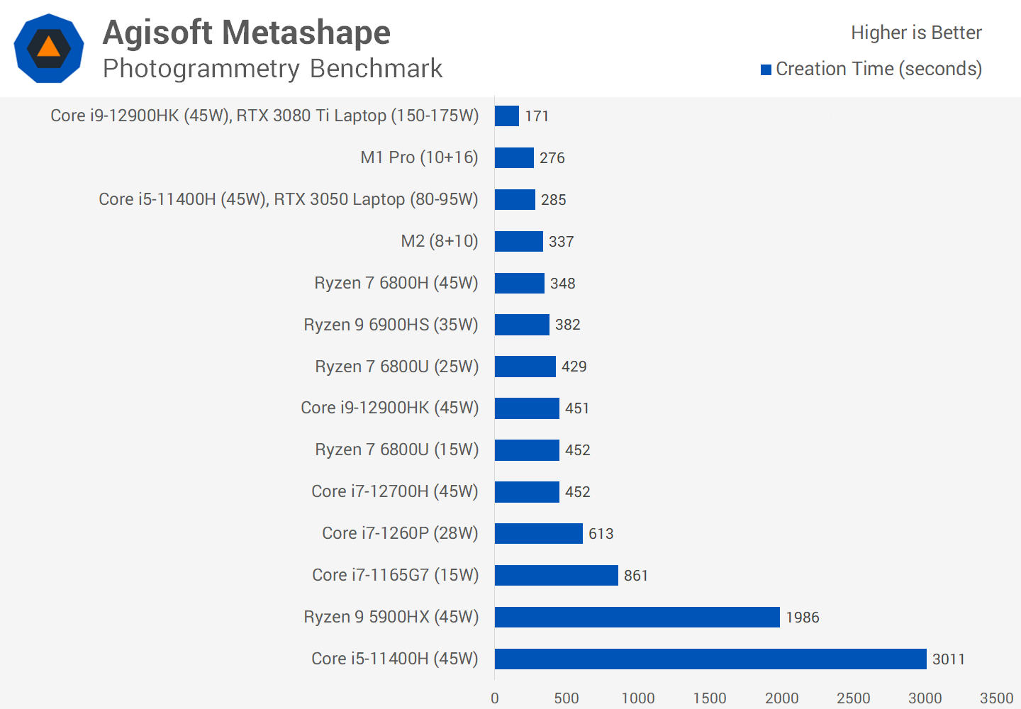 Our final productivity workload is Agisoft Metashape, a photogrammetry benchmark which is mostly run on the GPU. Here the M2 again flexes its muscles, completing the task 27 percent faster than the Ryzen 7 6800U at 25W. That's not as much of a margin as in the Blender GPU accelerated benchmark, but still a substantial difference given both products are running at roughly the same level of power consumption for GPU accelerated tasks.
