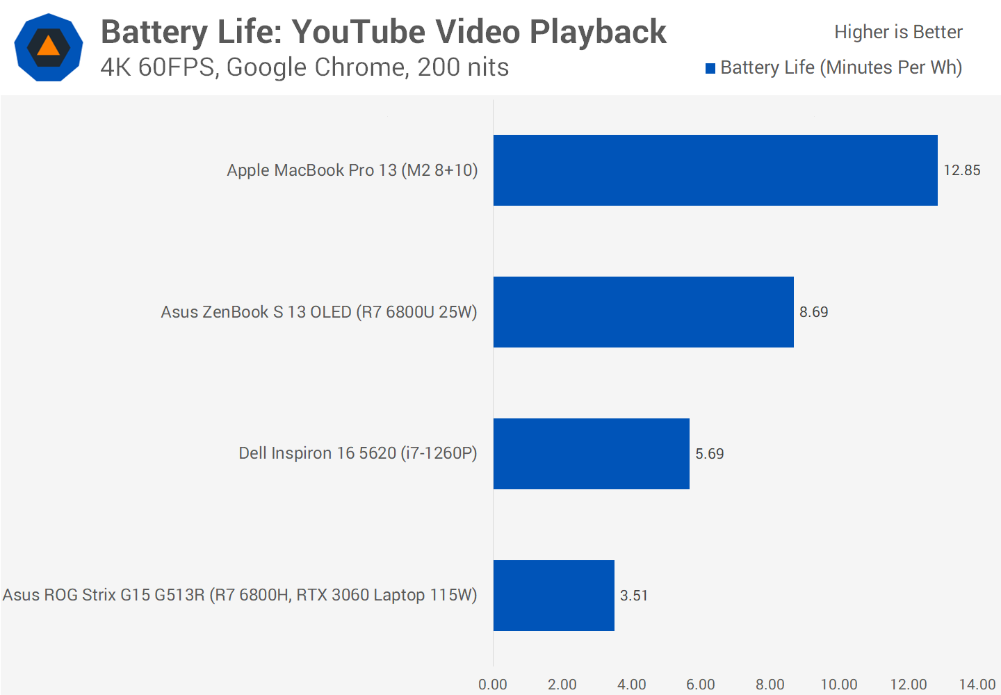 Battery life is the one of the most impressive aspects to the MacBook Pro 13's performance. In a YouTube 4K playback test in Google Chrome, the M2 powered system lasted over 40% longer per watt/hr than the next best system that used the Ryzen 6800U. We're using per watt/hr metrics here to normalize for battery capacity, so that larger batteries are not significantly influencing the results.
