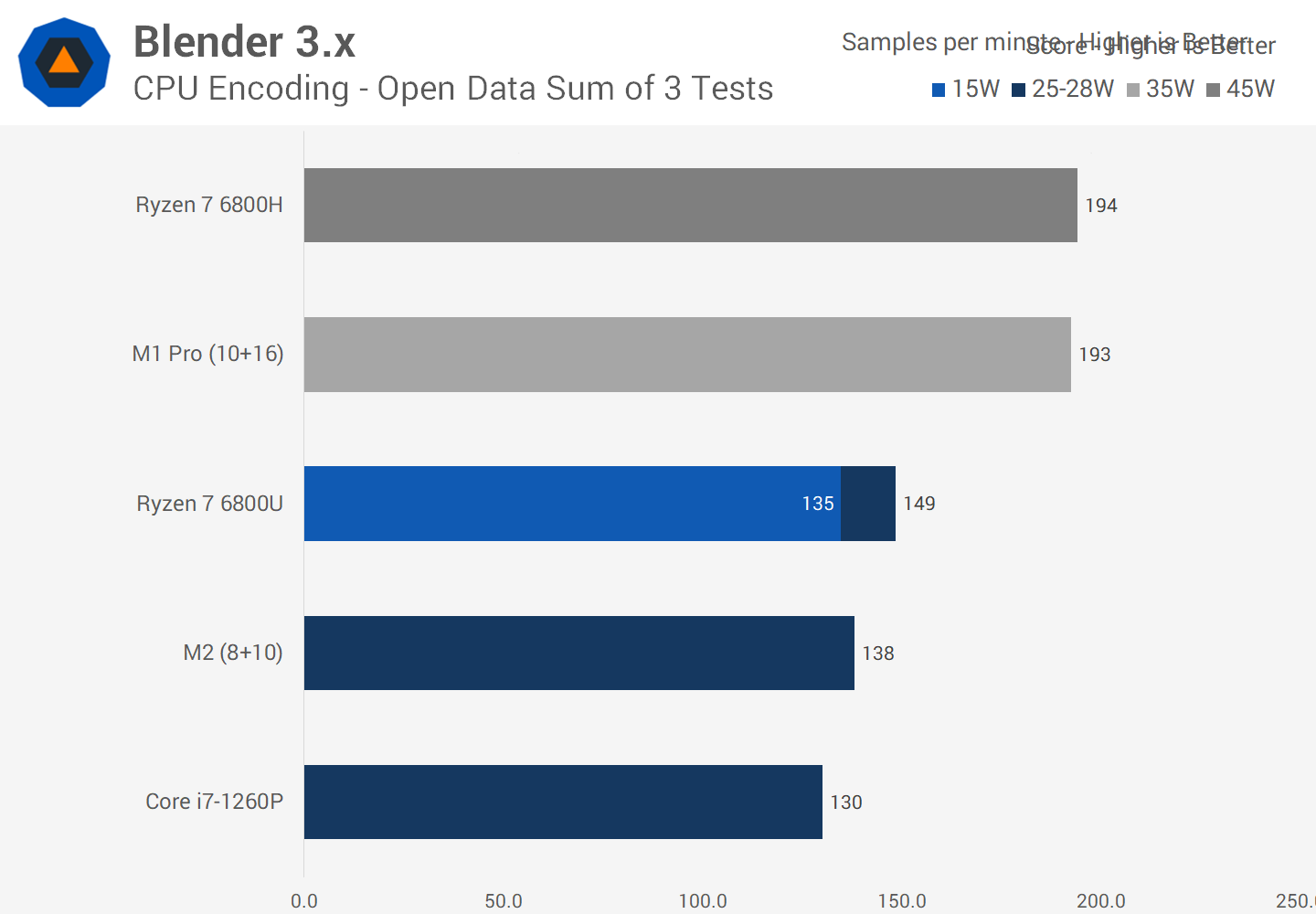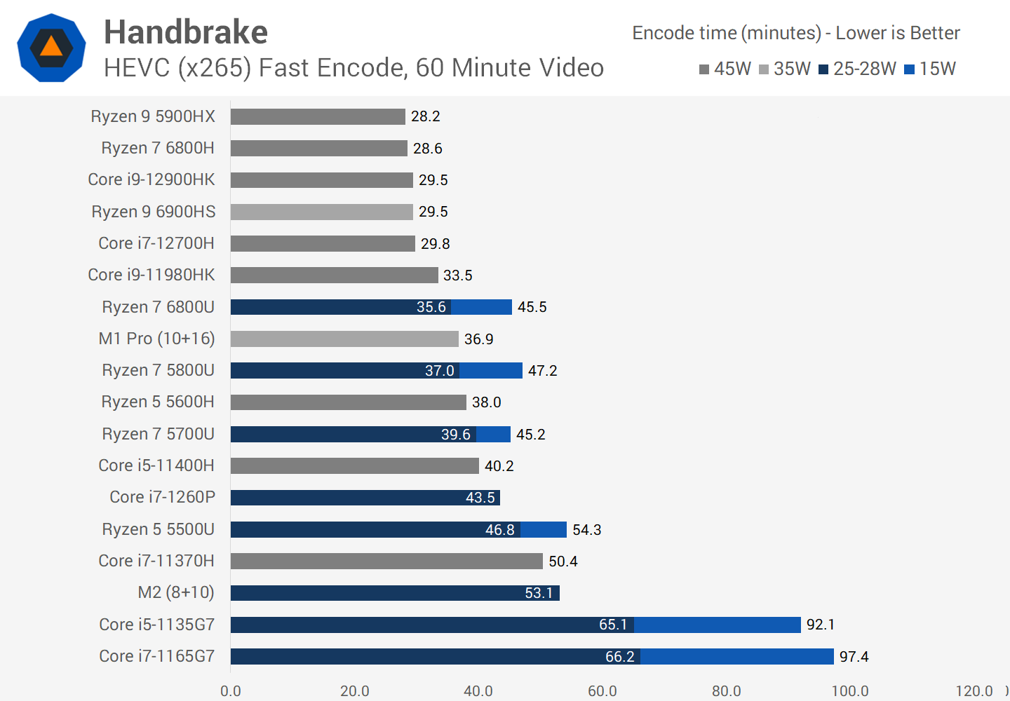 The M2 is not great at CPU-based video encoding in Handbrake. This is a heavy multi-threaded task that utilizes AVX instructions on x86 processors, which appears to give them an advantage over Apple's Arm. The Ryzen 7 6800U in its 15W configuration is 17 percent faster despite using less power, and several other parts are also superior, including Intel's 1260P.