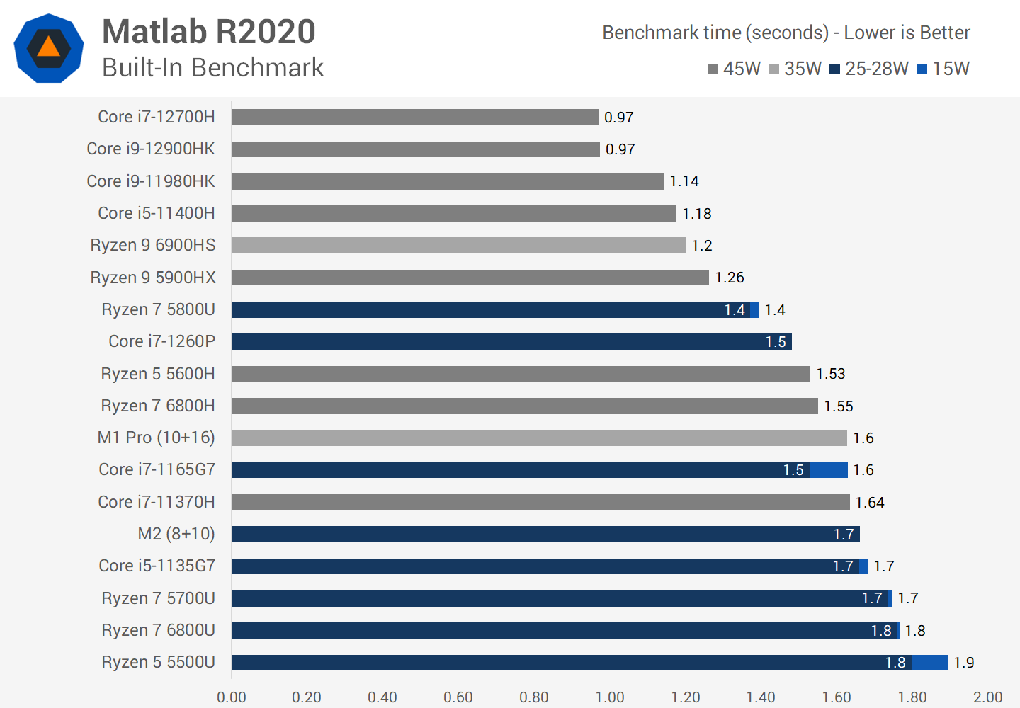 In Matlab the M2 performs similarly to the M1 Pro using the built-in benchmark. This is one of the last remaining apps that doesn't have a native Apple Silicon version, so emulation is required and that hurts performance. The Core i7-1260P ends up 12 percent faster, which is not at all terrible with emulation but we suspect it could be better were this app native.