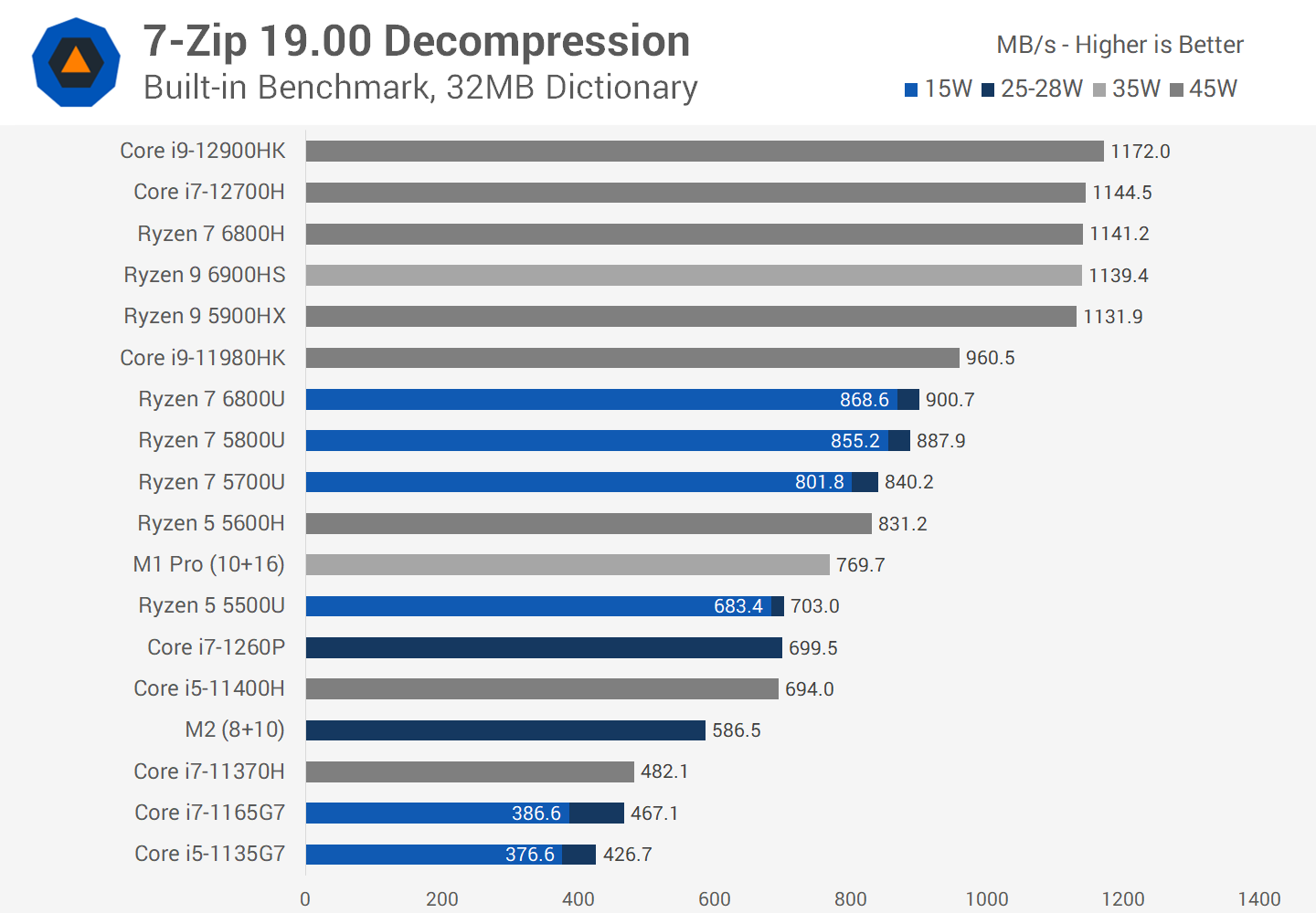 However for decompression the story is inverted, now it's the M2 that is the least impressive part of the current generation models. The 6800U is a real beast in this workload, delivering 53 percent more performance in its 25W configuration. The 1260P is also 19 percent faster, though this looks less impressive given the 1260P uses more power than the M2. The AMD CPU does as well, but at least you get a big improvement in performance there.