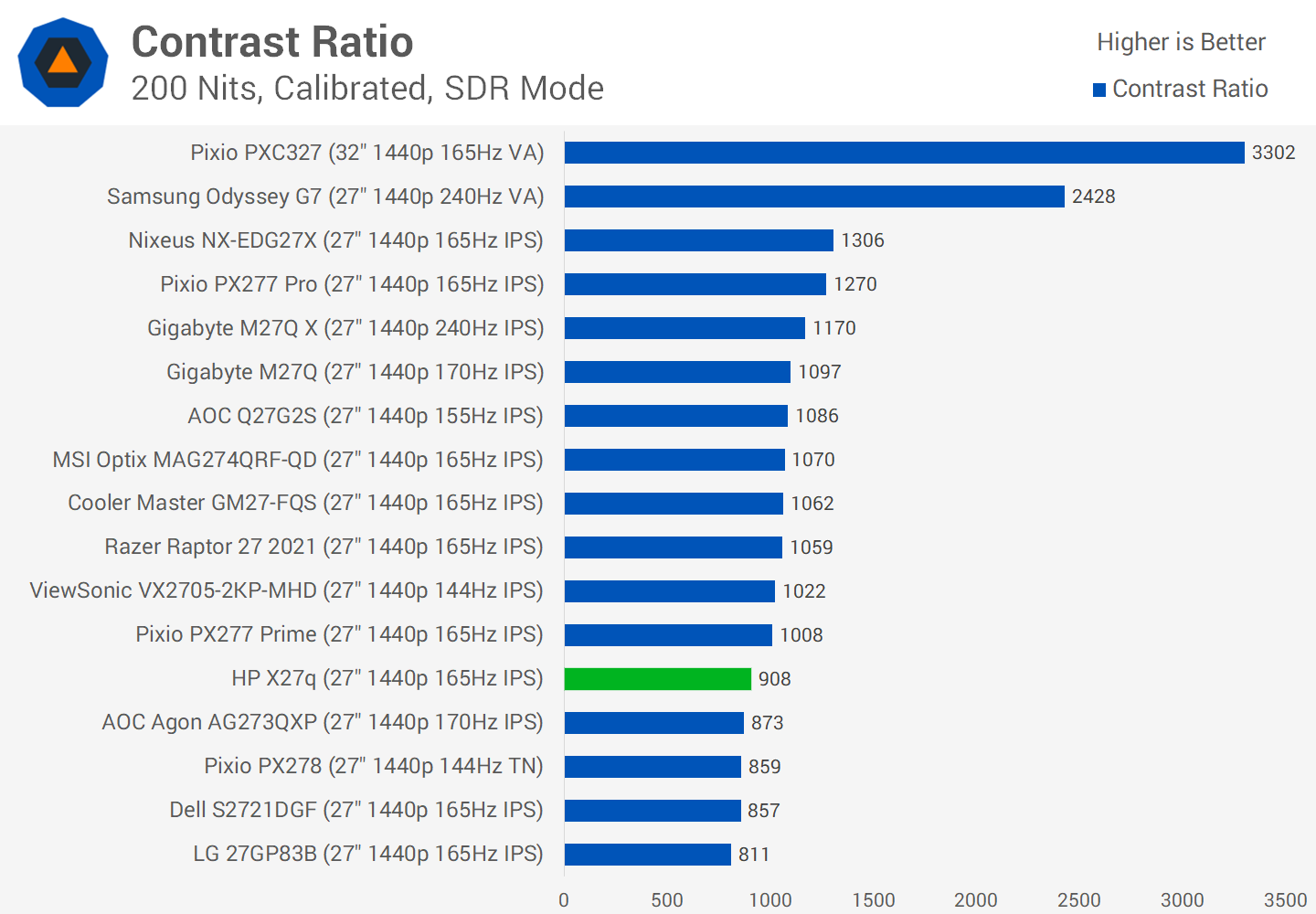 The contrast ratio though is disappointing. Despite HP claiming a 1000:1 result, in my testing I only achieved 908:1 after calibration, which is weak and below average for an IPS monitor. It's not quite as bad as the Dell S2721DGF, but we're in that range, as the X27q also uses an LG panel. Monitors like the Gigabyte M27Q are much better choices if you value things like black levels and plan on using the monitor mostly in darker environments.