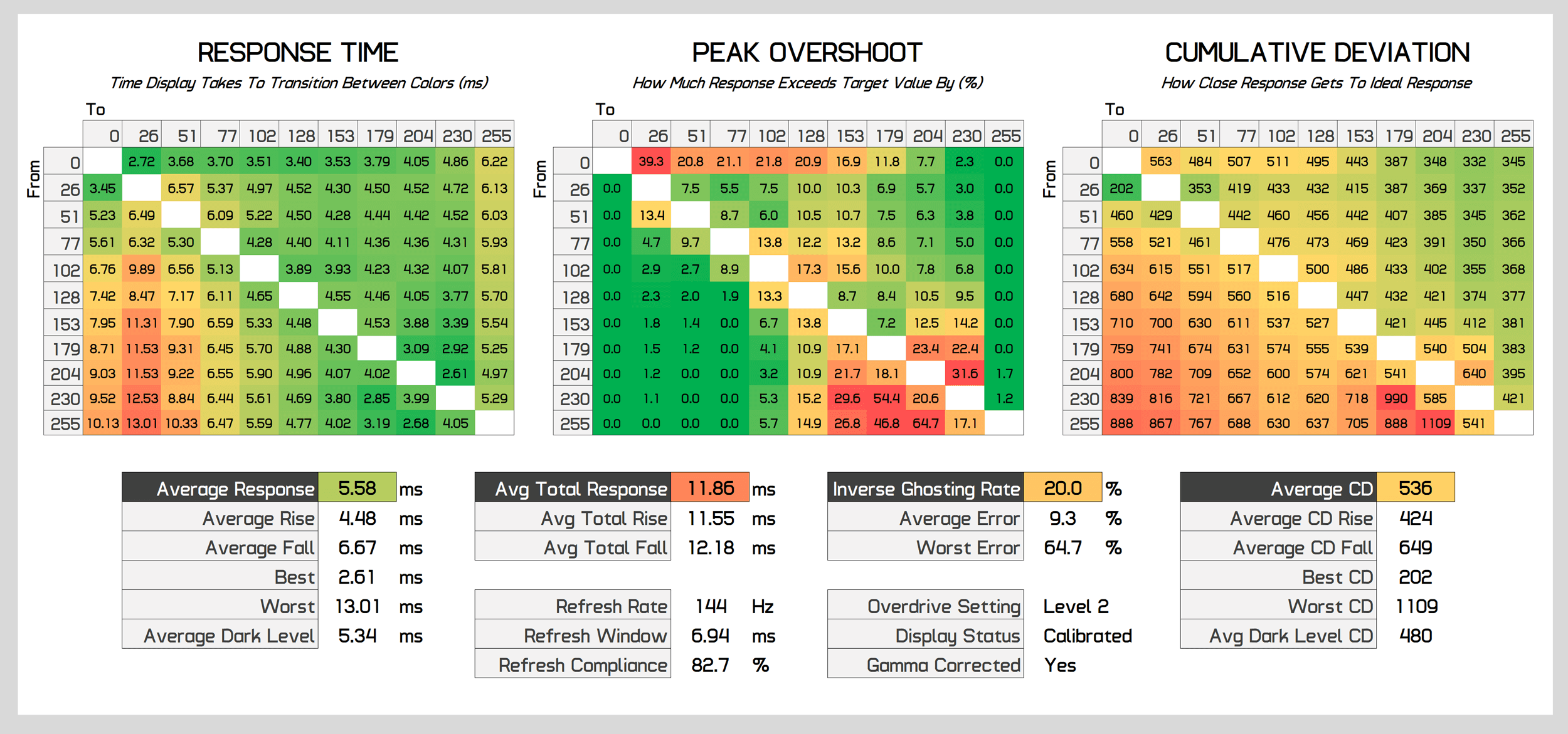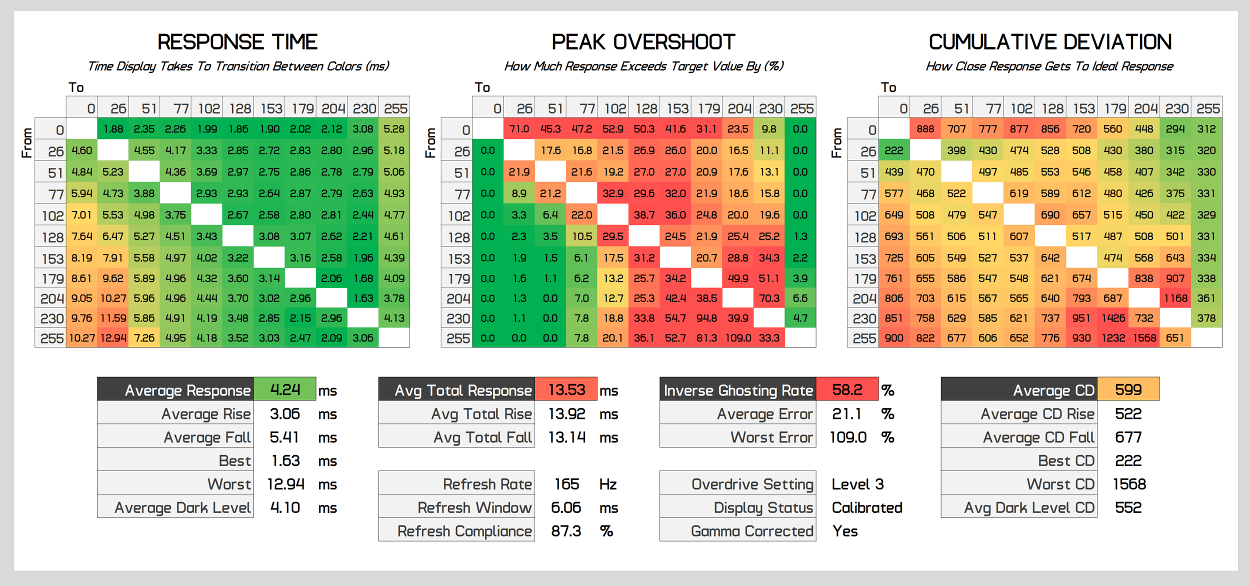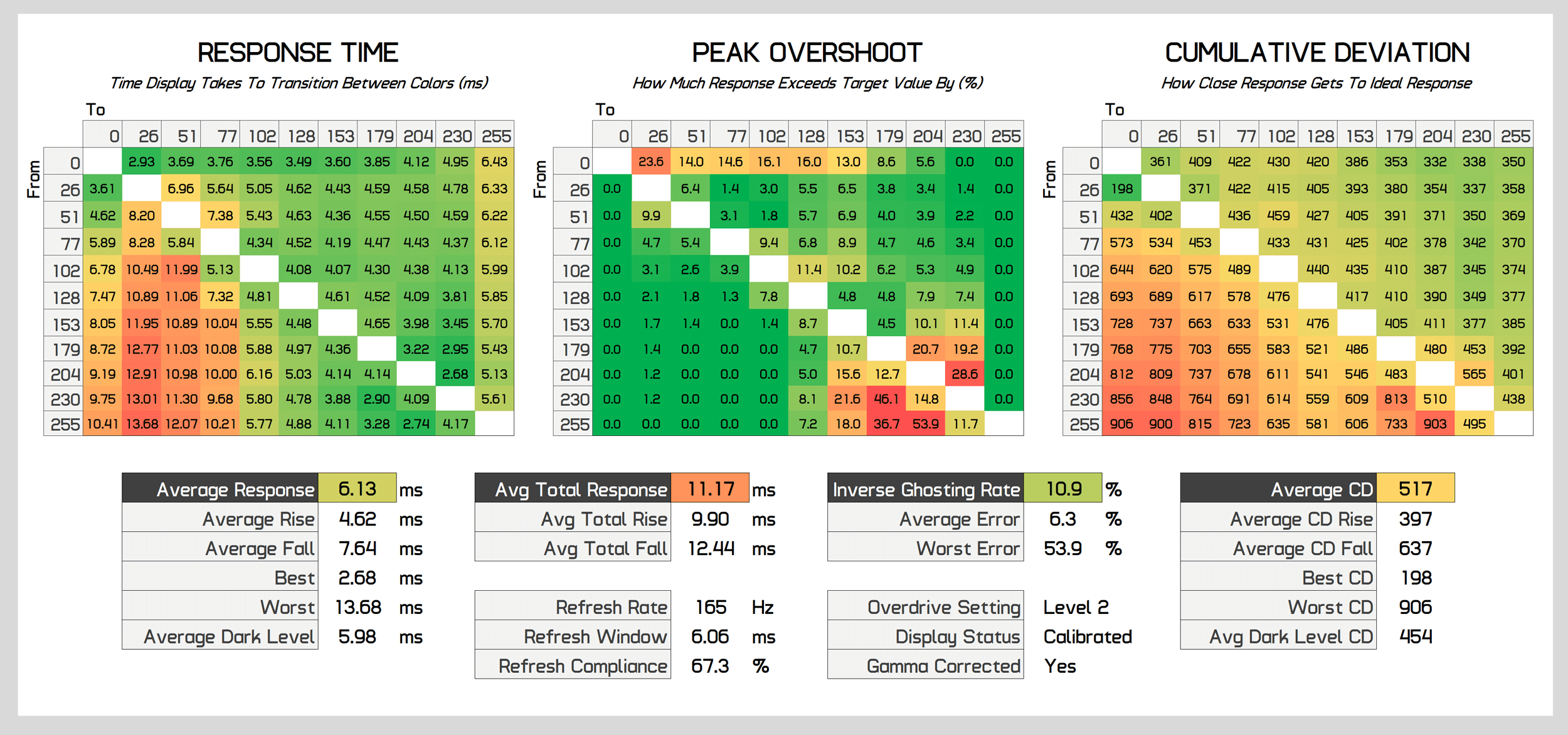When we move up to Level 2 overdrive, this is where the monitor is most usable at 165Hz. Performance improves significantly to a 6.13ms grey to grey average, and although overshoot has also increased, it's to a minimal level that you won't notice while gaming. Cumulative deviation is also now around a more acceptable level, with a score of 500 being around the average we like to see for this class of monitor.