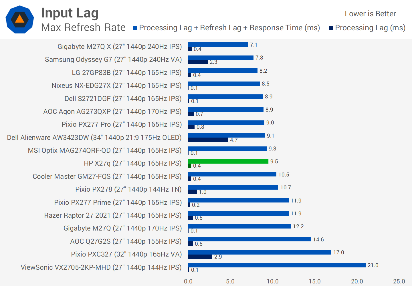 The X27q is generally a responsive monitor to use, the OSD is quite fast. So I'm not surprised the input latency is low, at just 0.4ms of processing delay. The major limiting factor is not so much the processing lag, but more the moderate refresh rate. 165Hz is a great starting point for PC gamers today, but if you want the best latency for competitive gaming, jumping up to 240Hz is the way to go, though you'll have to spend roughly twice as much if you want to stay at a 1440p resolution.