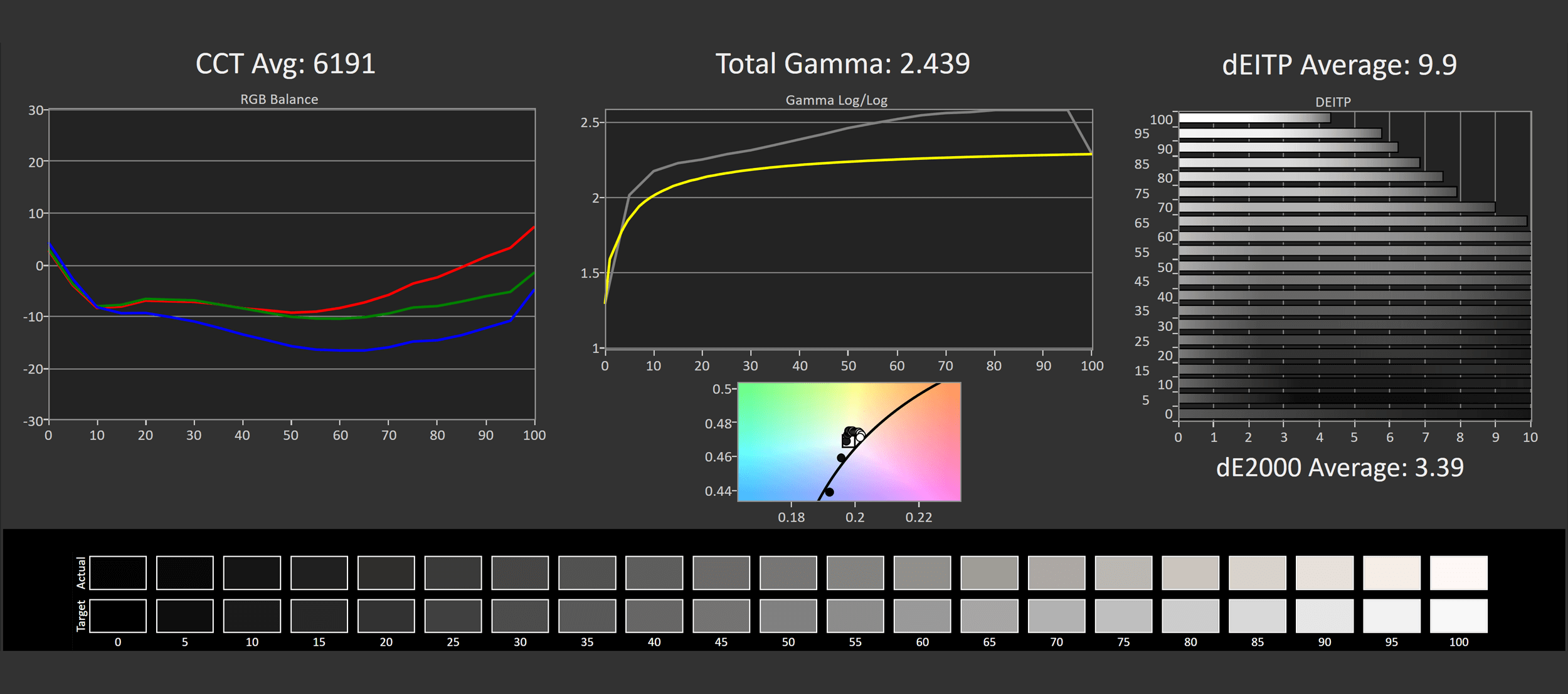 Out of the box, greyscale performance is average. The X27q ended up a bit too warm, and the gamma was too high, making some shades darker than they should be. This caused weak deltaE performance.