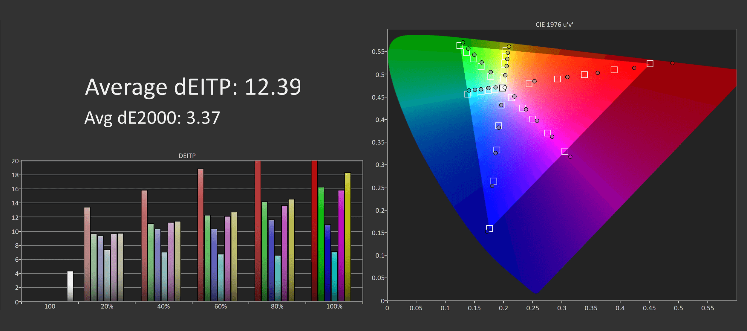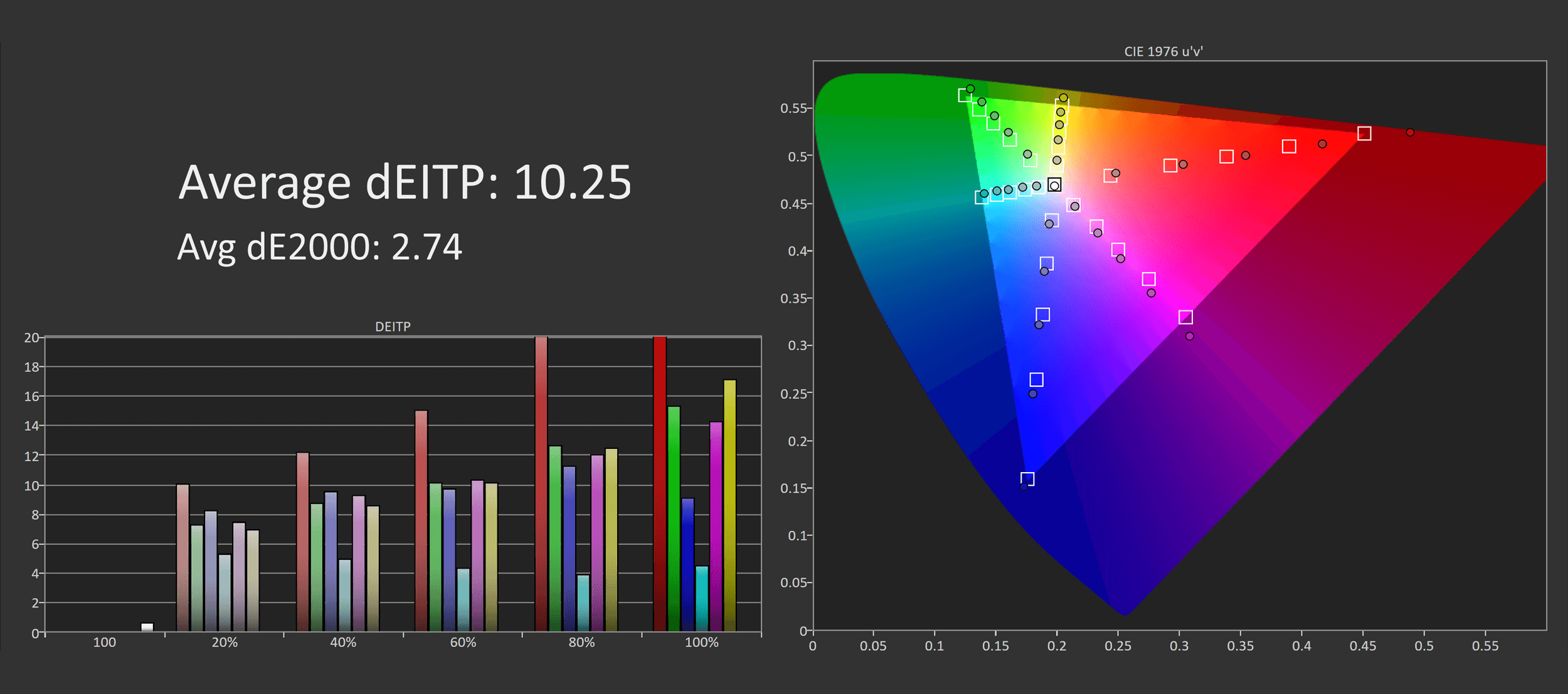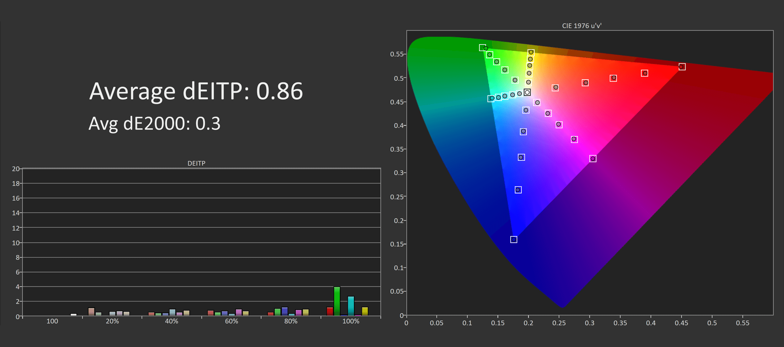 We do get an extension to the Rec.709/sRGB gamut in the red, yellow and magenta directions, but no extension for greens or cyans. This creates a bit of unbalance for DCI-P3 coverage, we get decent coverage of reds, but poor for greens, and only 91.2% coverage in total. A bit strange, and not very suitable for displaying color accurate wide gamut images.