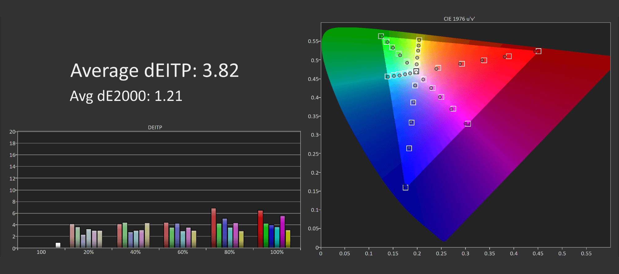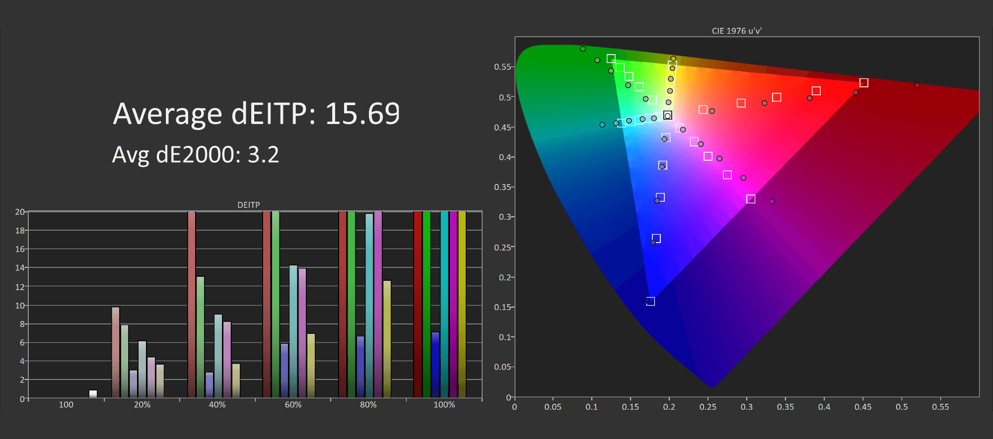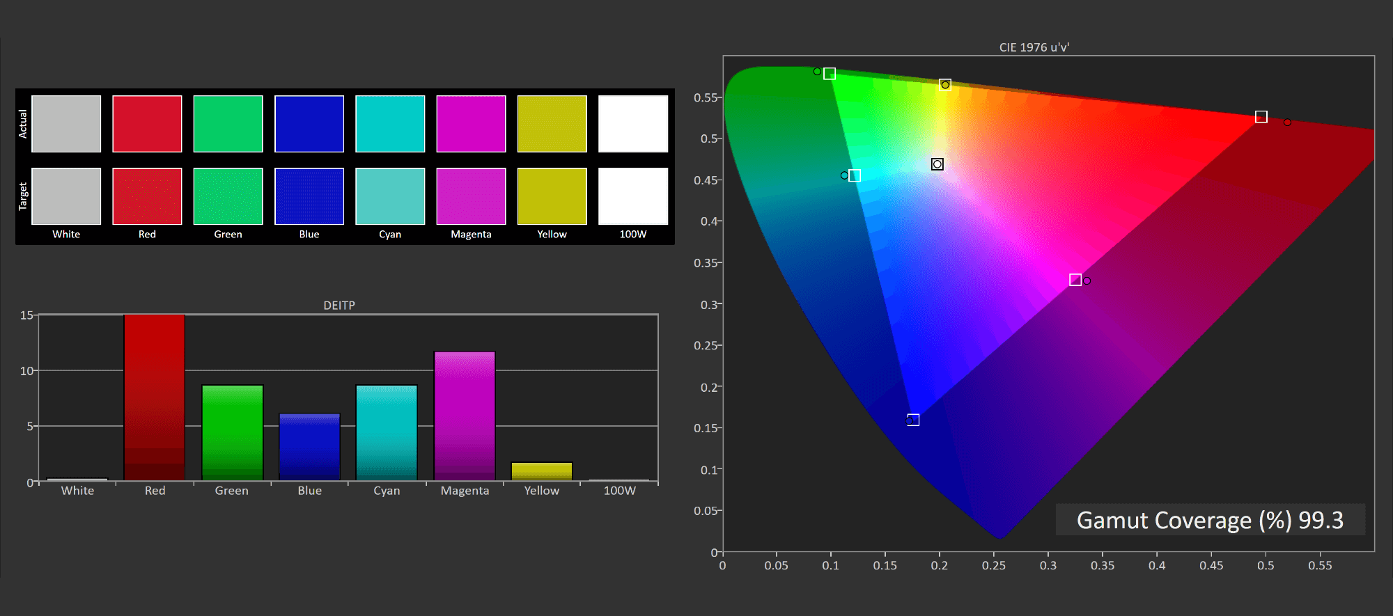 The Alienware AW3423DW has a very wide color gamut, particularly for P3 coverage, hitting 99.3% which is the highest we've seen. It also extends somewhat into the green range, giving us a decent 97% coverage for Adobe RGB. All up, this equates to 80% Rec. 2020 coverage, giving us great coverage of multiple gamuts.