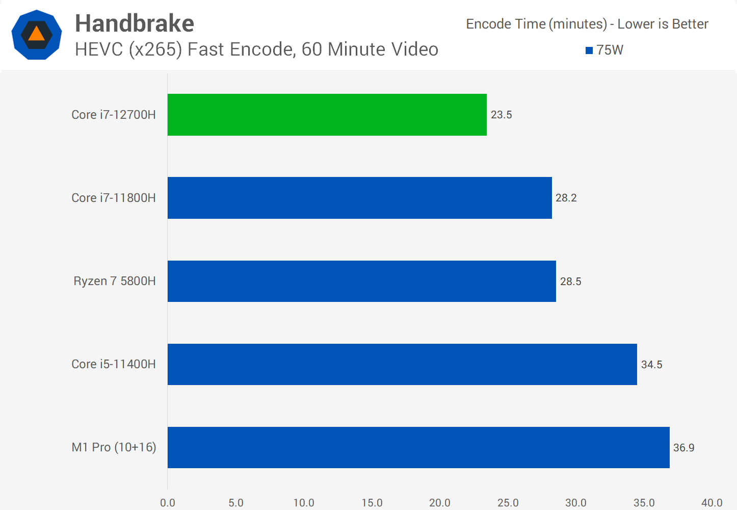 But like in Handbrake, when the 12700H is given 75W of juice to work with, it can accelerate beyond the other processors we've looked at to post quite an impressive score that makes this new generation well suited to CPU rendering.