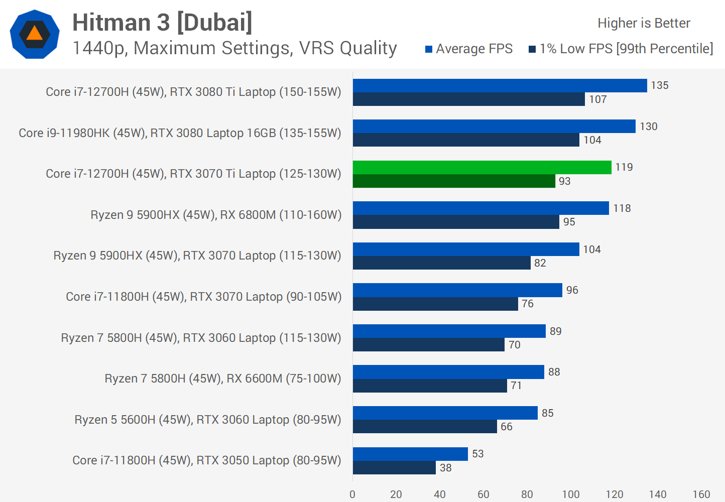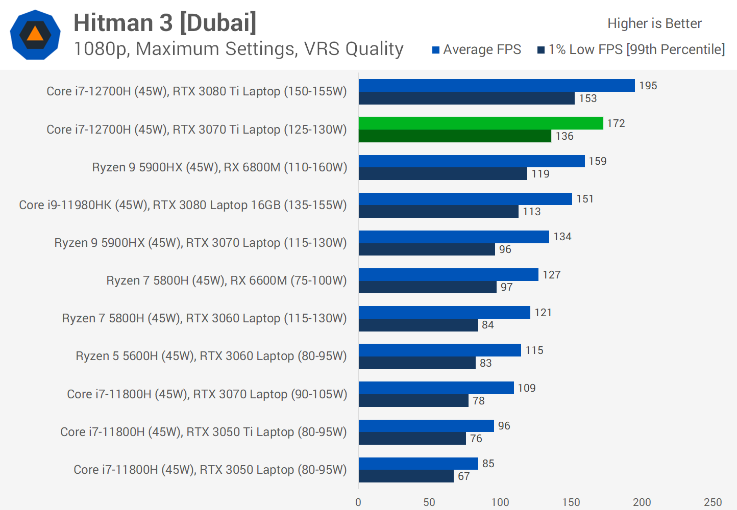 With this generation of laptops, you're generally going to be getting both a GPU and CPU upgrade, and this is evident in a couple of games like Hitman 3. Using the Dubai benchmark at 1080p, the 3070 Ti configuration is significantly faster than previous models, 28% faster when paired with the Core i7-12700H compared to the RTX 3070 with Ryzen 9 5900HX. This is a combination of both CPU and GPU performance gains, helping to alleviate the bottleneck at high framerates while also delivering more GPU headroom.