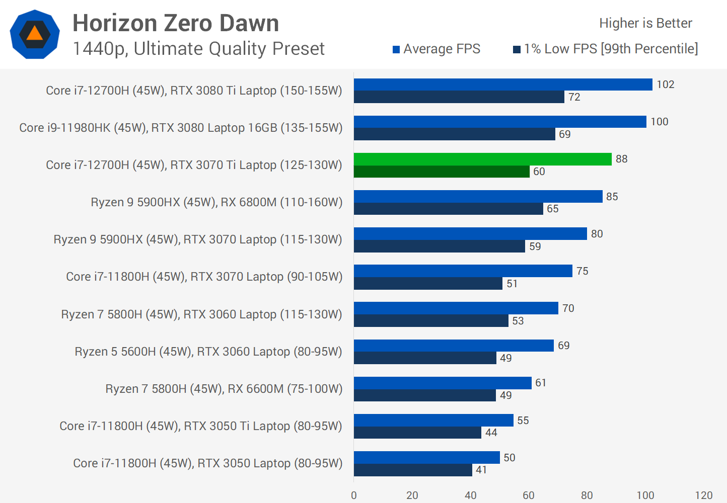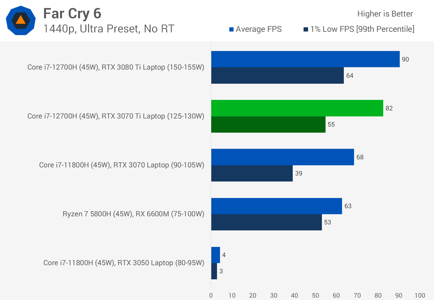 In total, we're seeing 16 percent better performance than the 115-130W configuration of the RTX 3070, which has essentially shifted this class of laptop up a tier compared to the previous generation, giving us a more comfortable buffer above 60 FPS on average.
