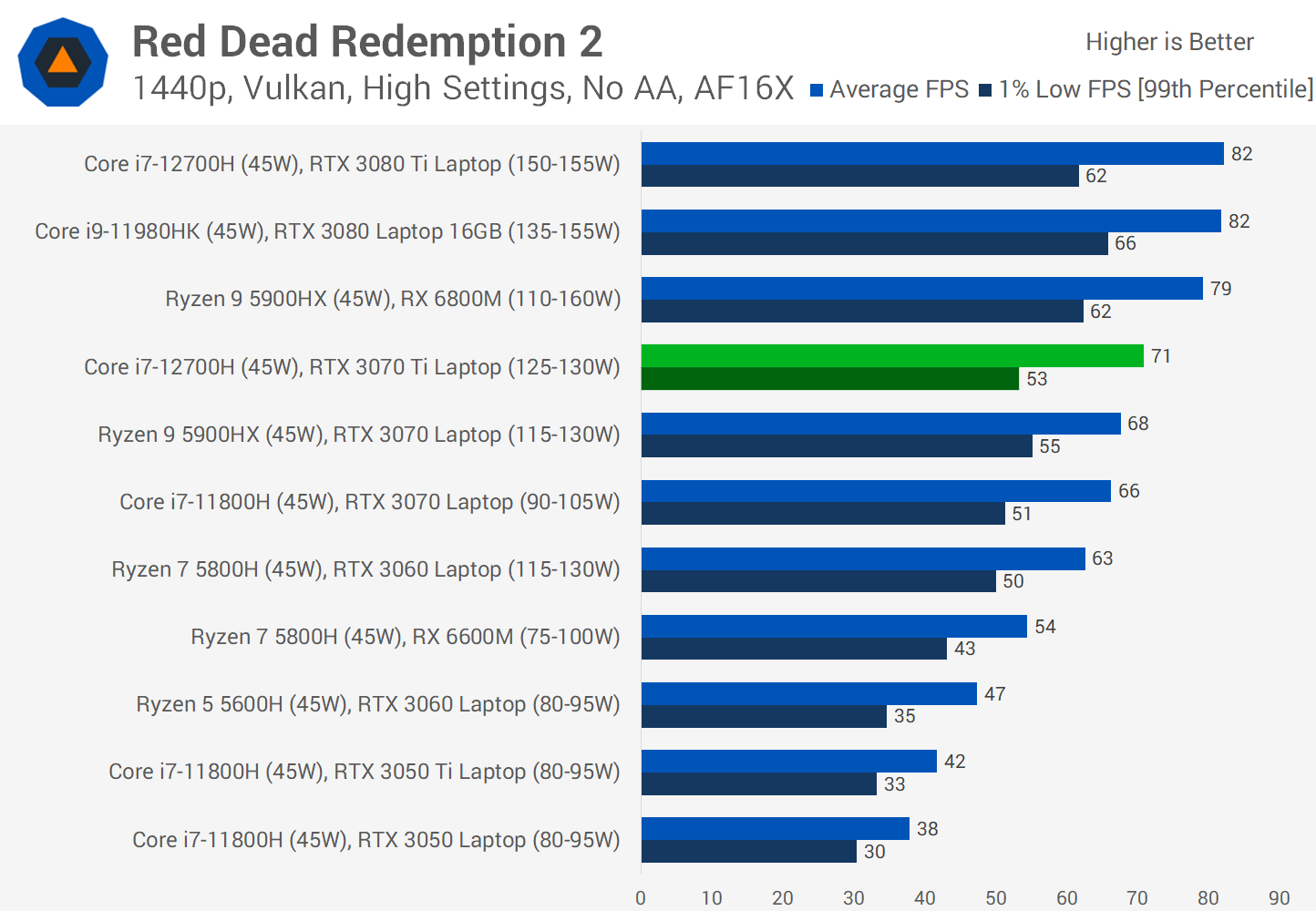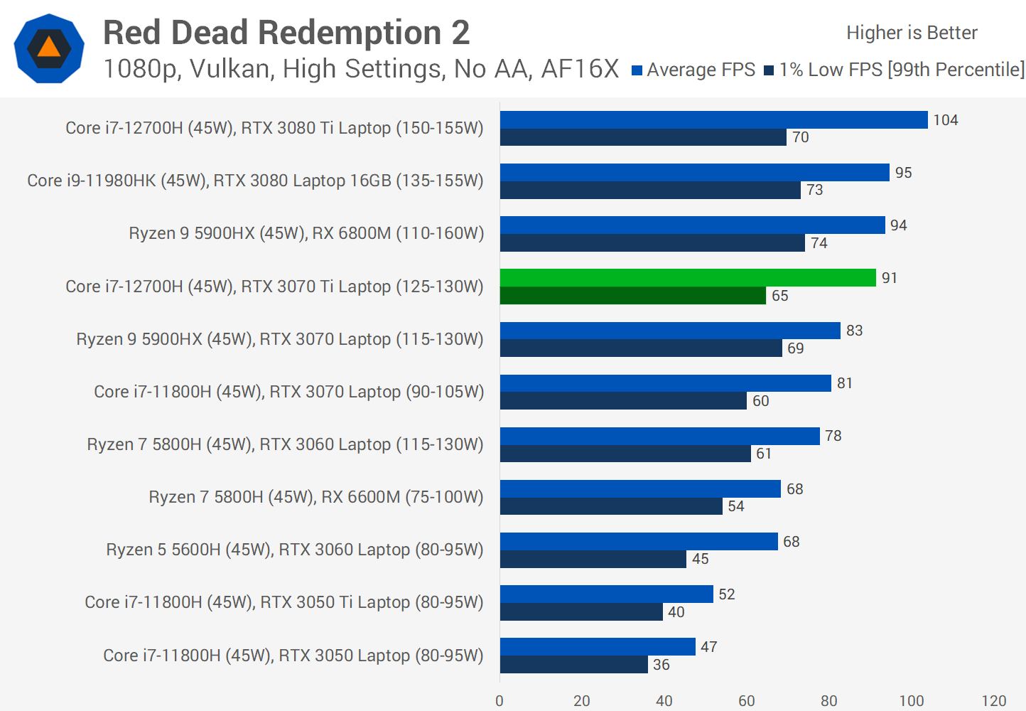 Red Dead Redemption 2 is a good result for the 3070 Ti, coming in only a few FPS behind the RTX 3080 Laptop and RX 6800M from AMD on average. At 1080p the new Ti model was 11 percent faster than the non-Ti model from last year, and just 3 percent slower than the 3080. However with a 12% gap to the 3080 Ti, you're not quite getting flagship levels of performance here.