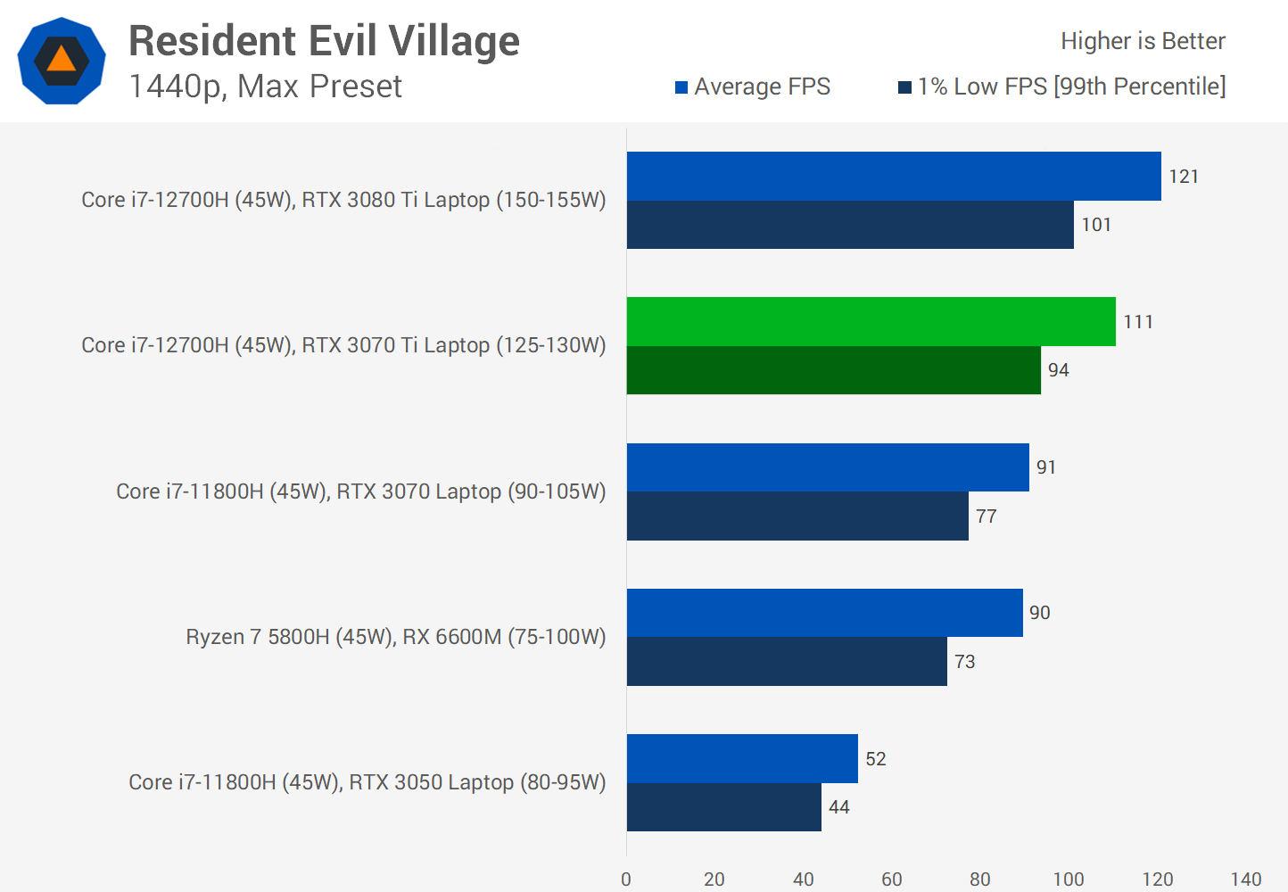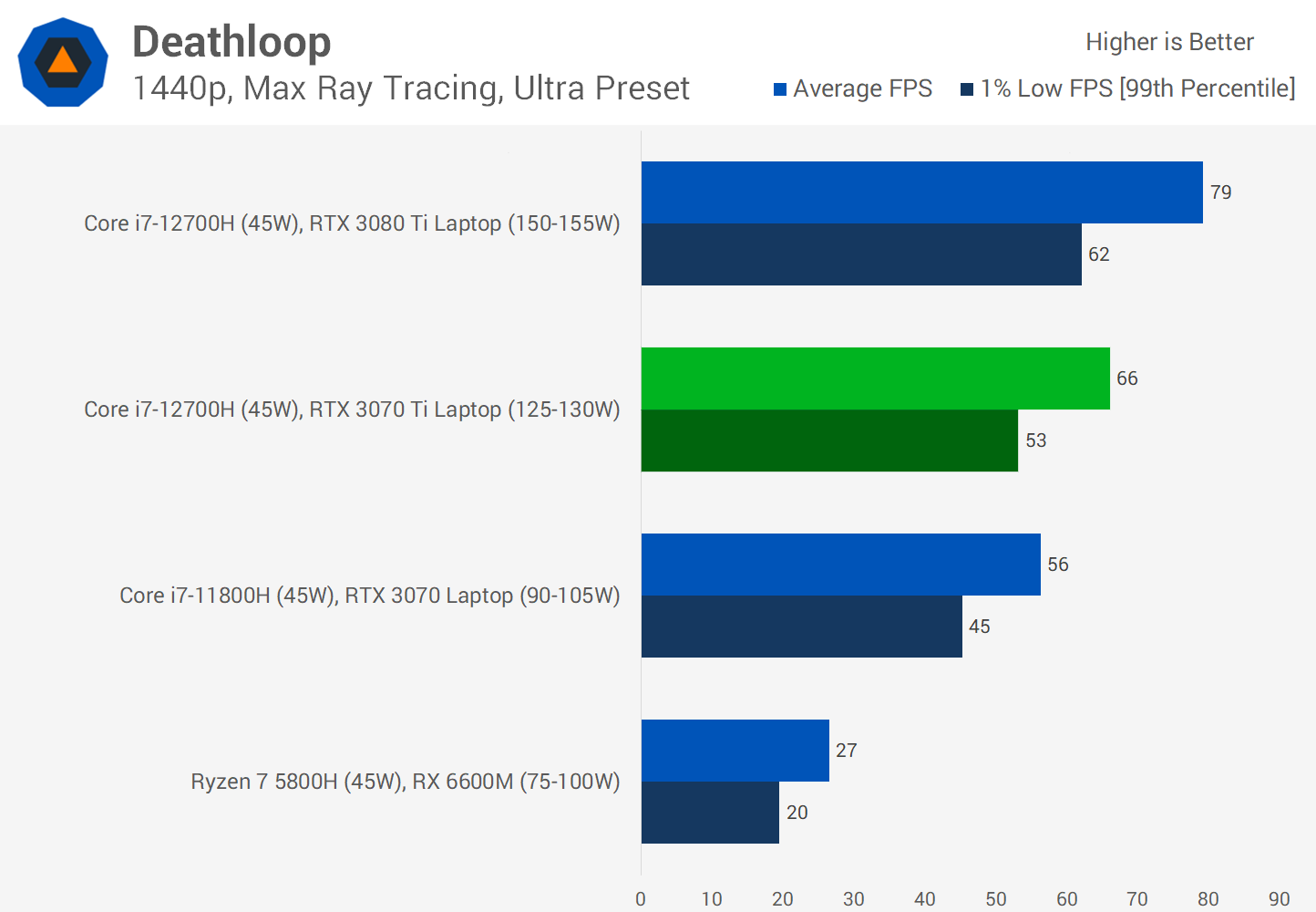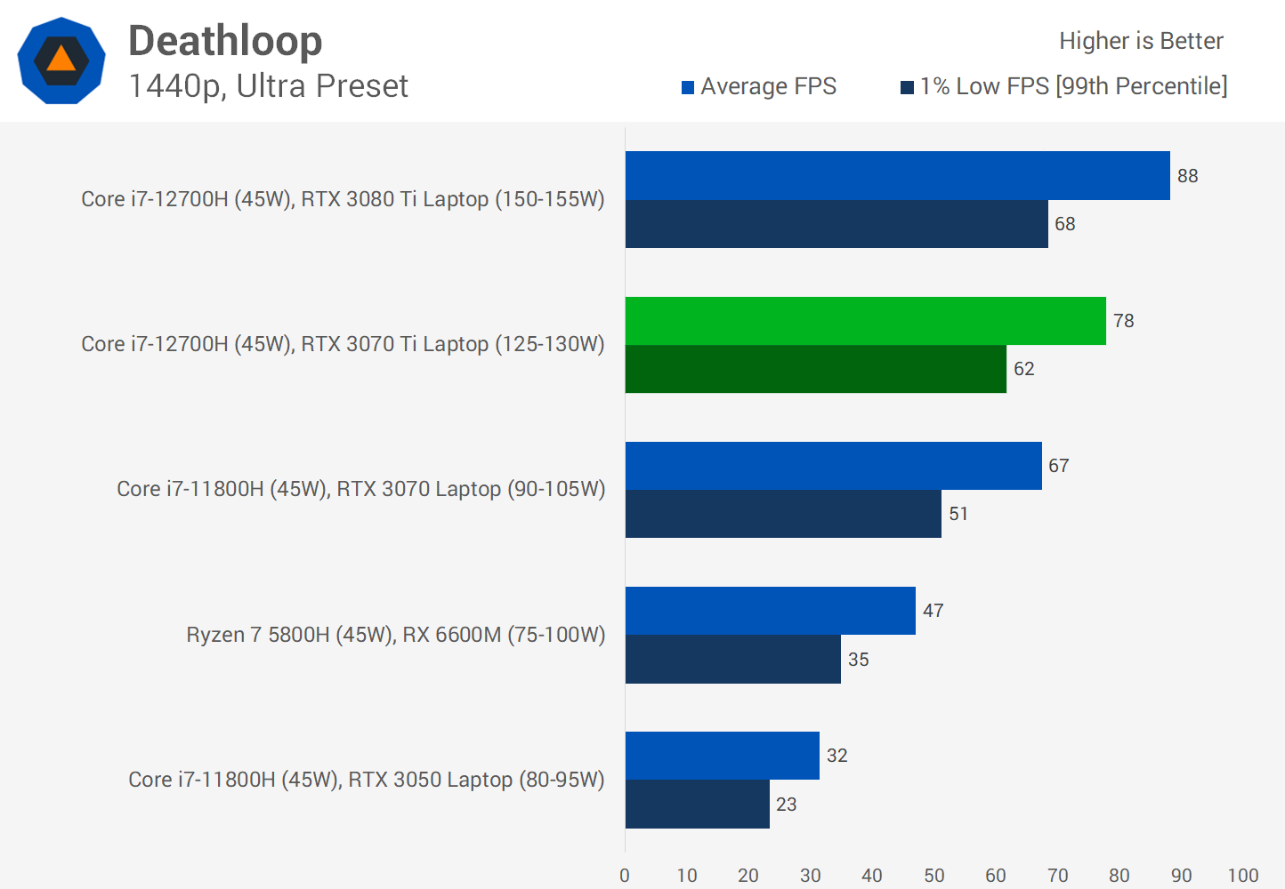 Deathloop is another title where there's about a 10 FPS gap between the 3070 Ti and 3080 Ti when playing at 1440p. Both GPUs are capable of a 60 FPS experience using Ultra settings at this resolution though which is very much a high end experience on a laptop.