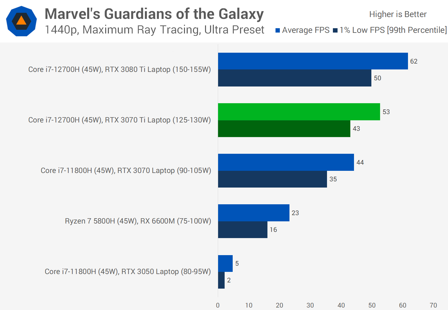 Guardians of the Galaxy ray tracing isn't so favorable, using the maximum ray tracing effects in conjunction with the Ultra preset leads to an average frame rate below 60 FPS, 15 percent slower than the RTX 3080 Ti. However as mentioned previously, this game supports DLSS, so when using the Quality mode it's quite easy to get that frame rate back up over 60 FPS with only a small loss to visual quality (which is especially hard to spot on a laptop-size display)