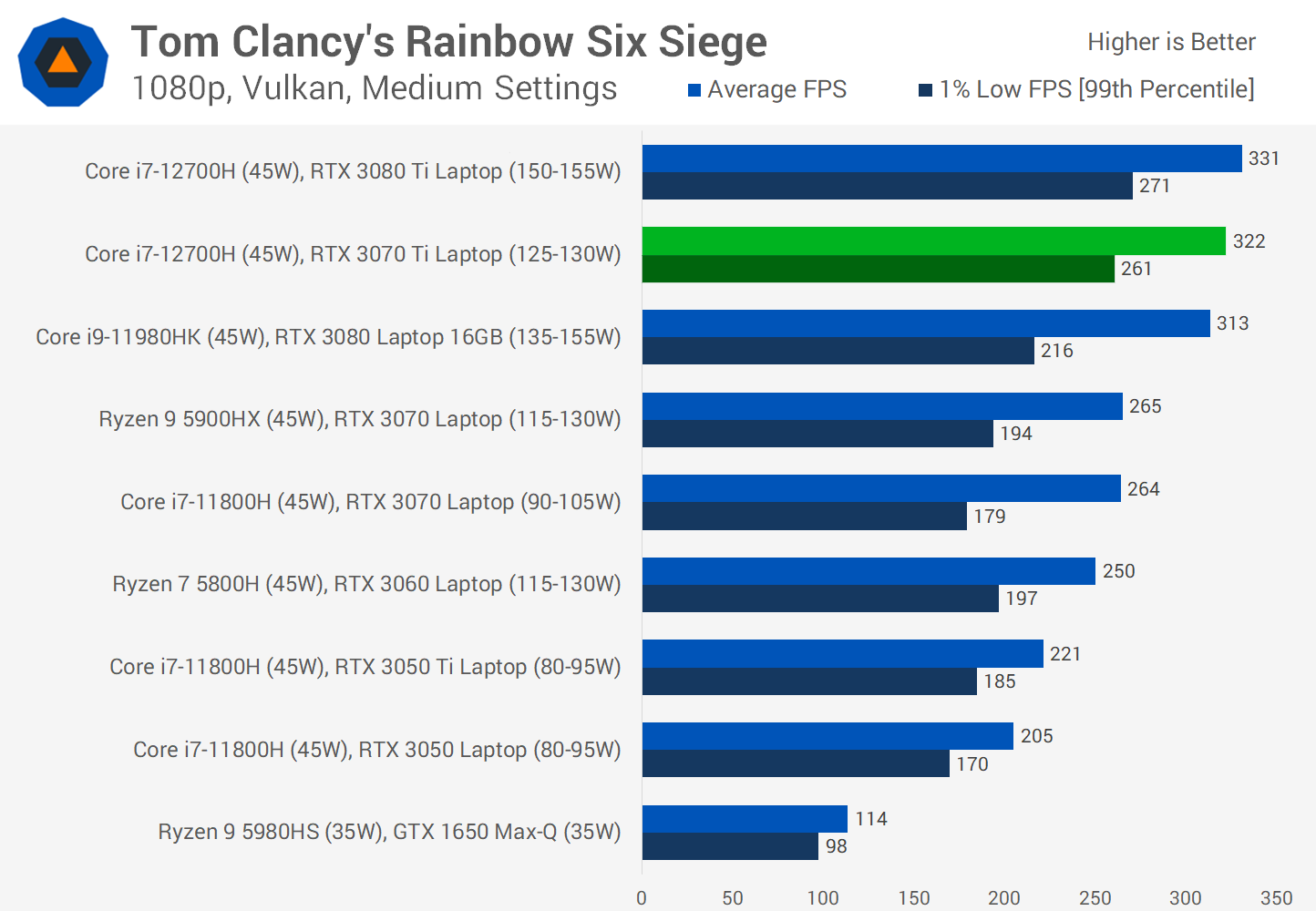 Similar story when looking at Rainbow Six Siege, the game is fully CPU limited at 1080p but when we focus exclusively on 1440p numbers we see the 3070 Ti fall pretty comfortably between the 3070 and 3080 configurations. The 3070 Ti is able to crank out over 240 FPS using medium settings in this title, which is perfect for the latest generation of 1440p 240Hz laptop panels.