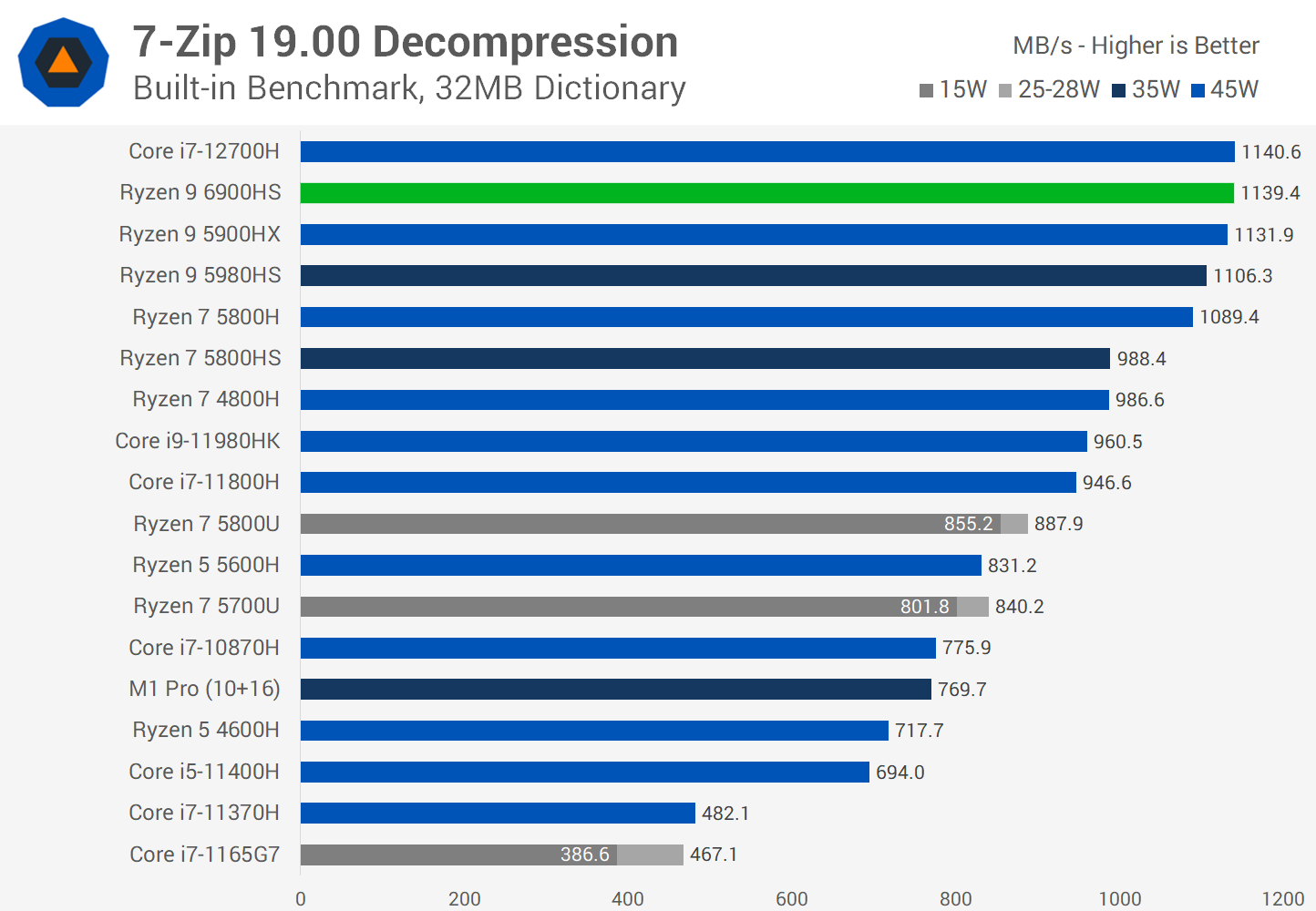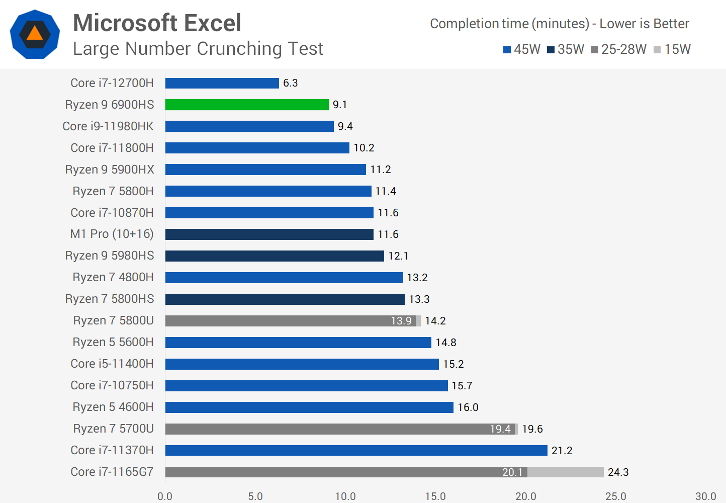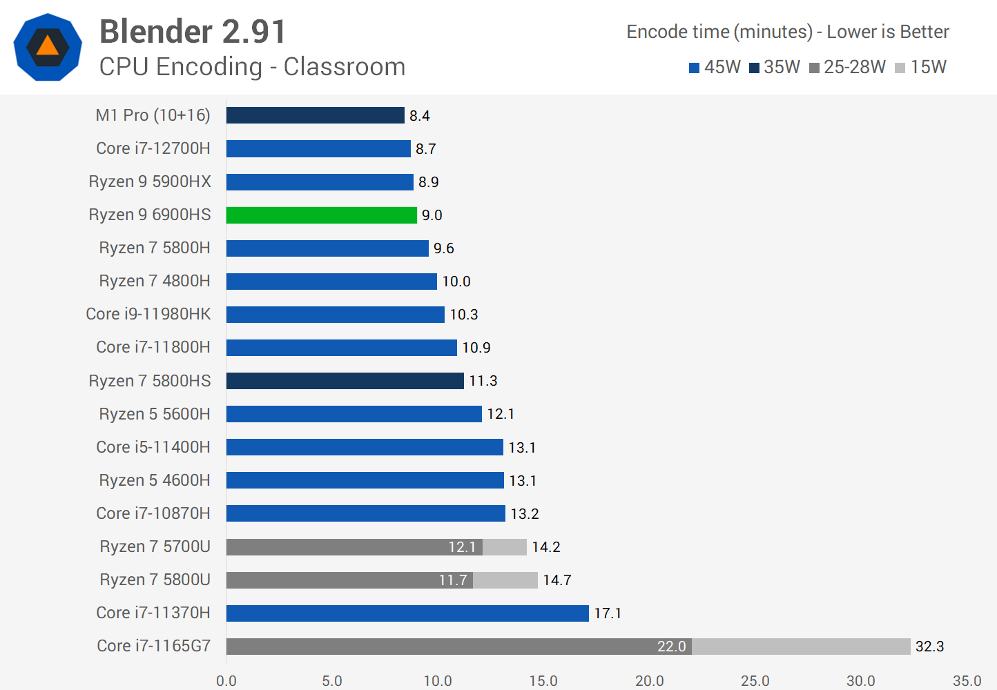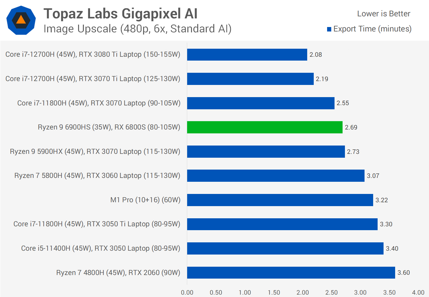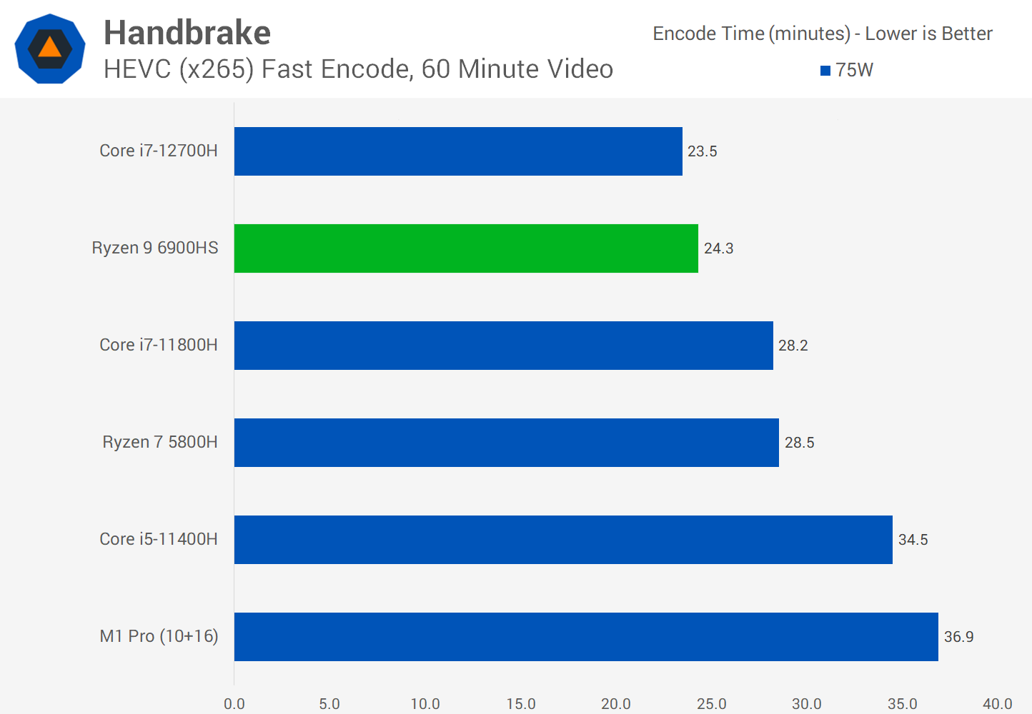 In this benchmark, the 6900HS is only 3 percent slower than the 12700H despite featuring a 35W TDP vs 45W, which suggests that AMD is delivering more performance per watt with this part. However, it can't match the Apple M1 Pro here, which has outstanding efficiency among the parts we've tested so far.