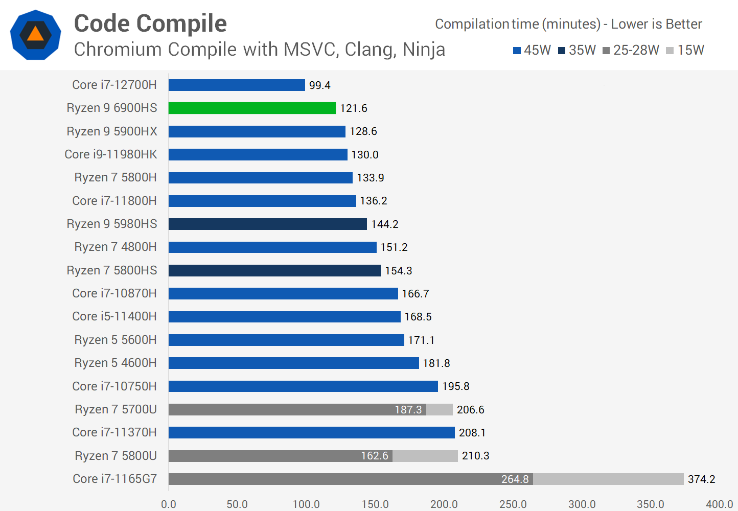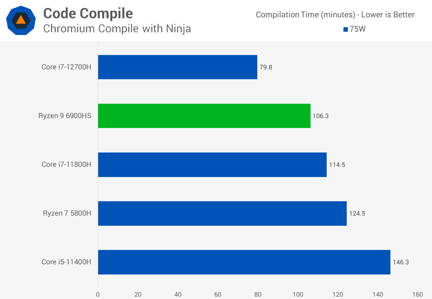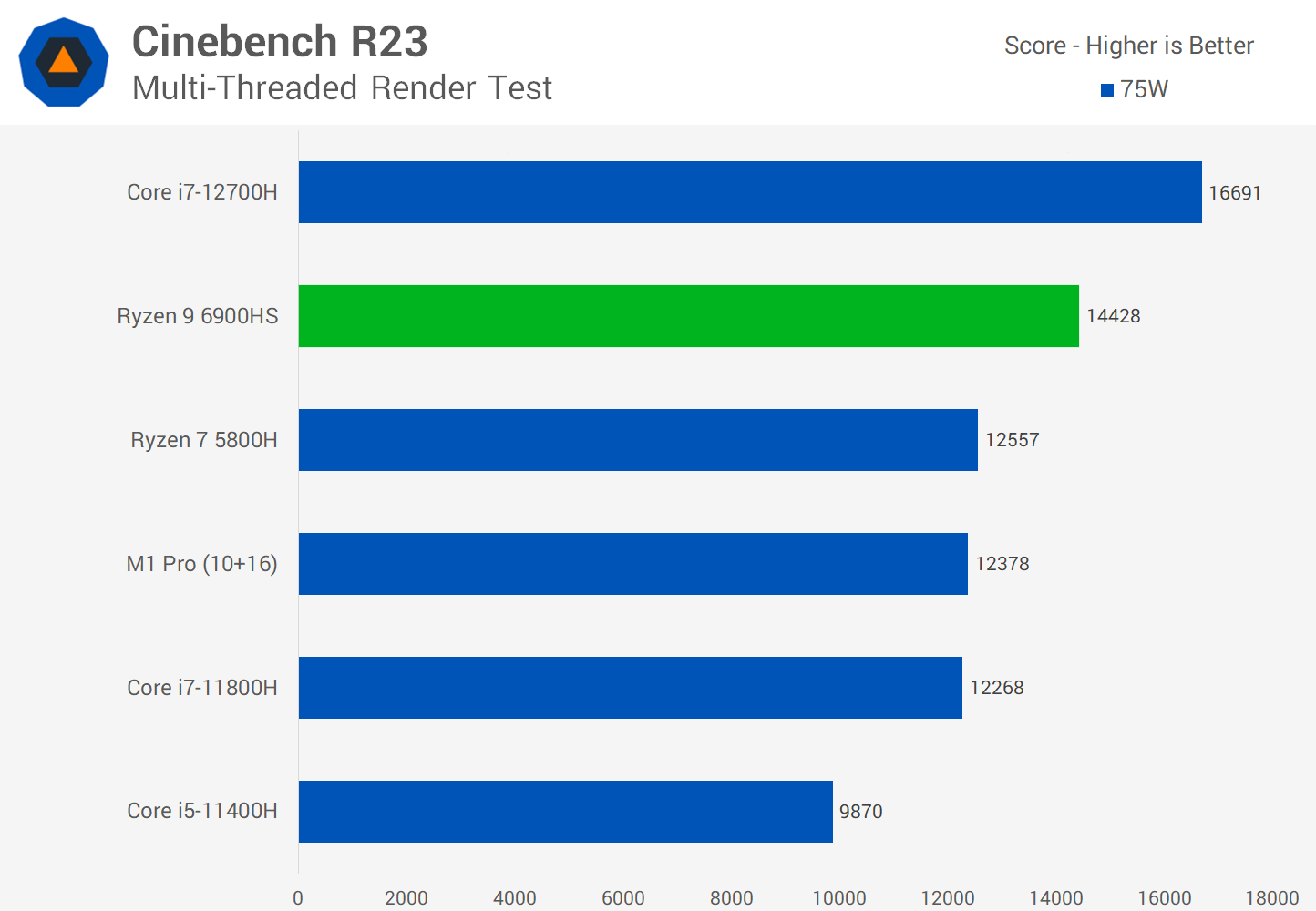 At 75W, Alder Lake scales particularly well, so while the 6900HS is able to push ahead of a part like the Ryzen 7 5800H at the exact same 75W configuration, the gap to the 12700H gets larger.