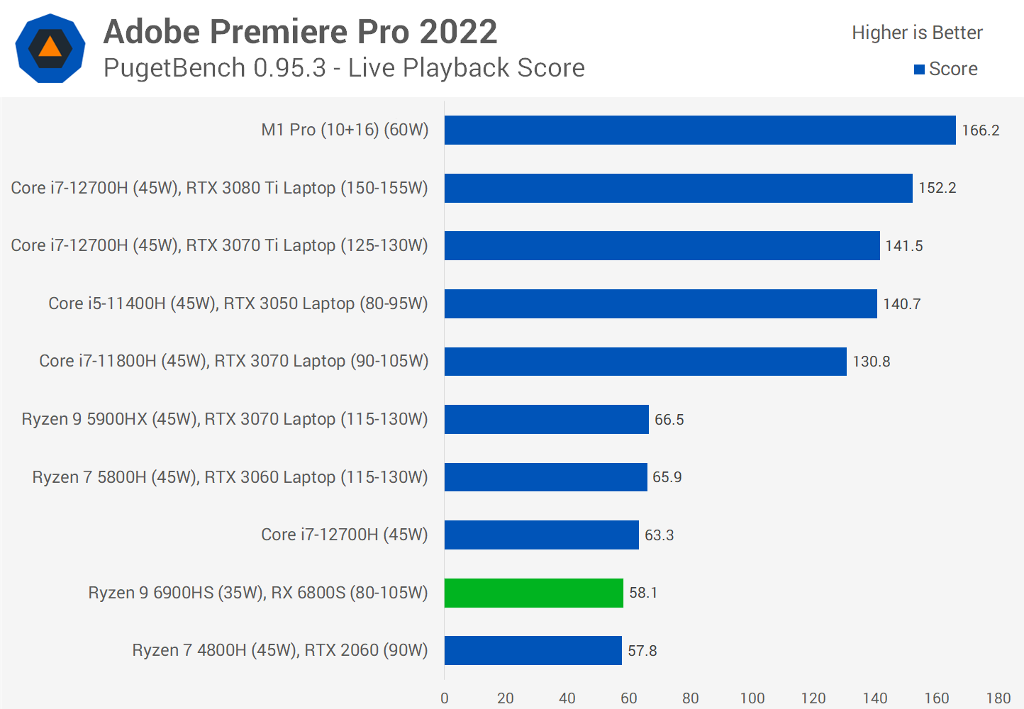 But it's not all bad in Adobe apps, the 6900HS plus 6800S configuration we think fares well in After Effects, outperforming older systems which at times have more power consuming parts. With just 115W of total system power to work with, it can't match the performance of the top-end systems in this chart that can push over 170W, but that's to be expected given the size and class differences.