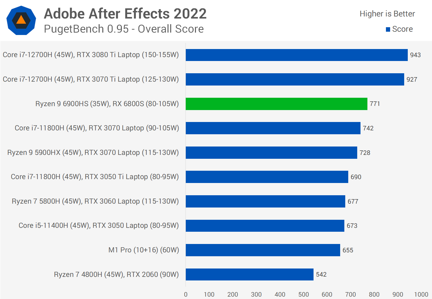 The Ryzen 9 6900HS plus RX 6800S configuration is very disappointing in Adobe Premiere 2022. In terms of overall score, this system simply can't keep up with models that use Nvidia GPUs, or ideally Nvidia plus Intel.
