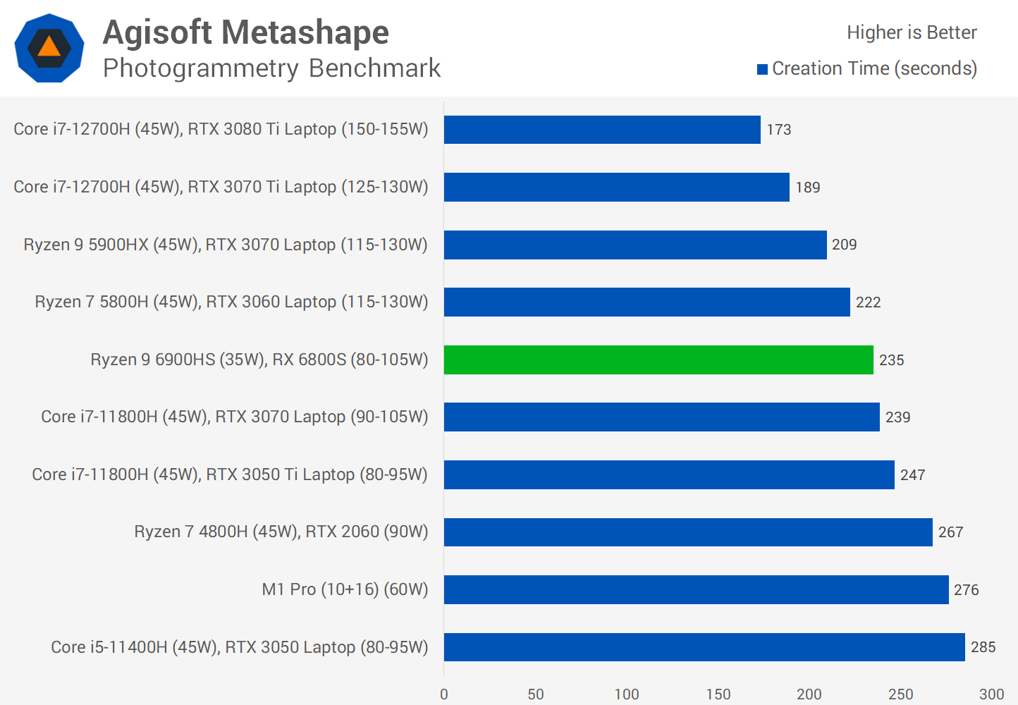 And lastly we have our Agisoft Metashape photogrammetry benchmark. Again the 6900HS plus 6800S configuration sits in the middle of the chart which we think is a solid result given its overall power consumption and form factor. Obviously larger systems with bigger GPUs are performing better here.