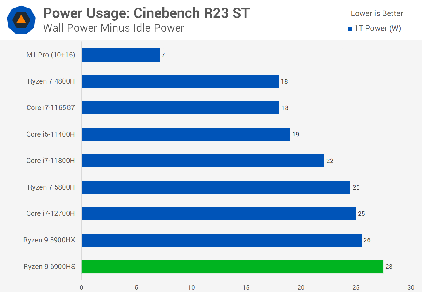 Measuring from the wall, the Ryzen 9 6900HS does use less power than 45W parts, and is quite similar to the M1 Pro for sustained workloads. However it's not a very efficient part for single-thread; pushing this CPU up to 4.9 GHz is clearly operating it well outside the efficiency window. It not only used more power than the 12700H in this test, it was also slower, which isn't ideal.