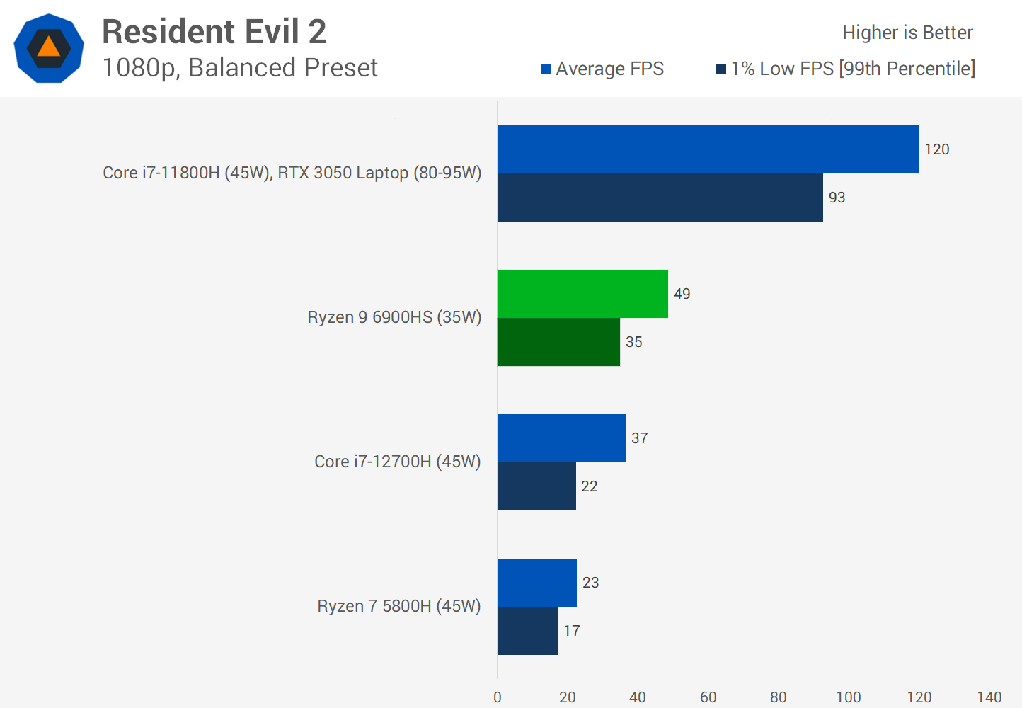 Resident Evil 2 is another title where the 6900HS was more than twice as fast as the 5800H in integrated GPU performance. 12 RDNA2 compute units was once again 32 percent faster than the 12700H's Xe GPU configuration, with both models tested using 32GB of DDR5-4800 memory.