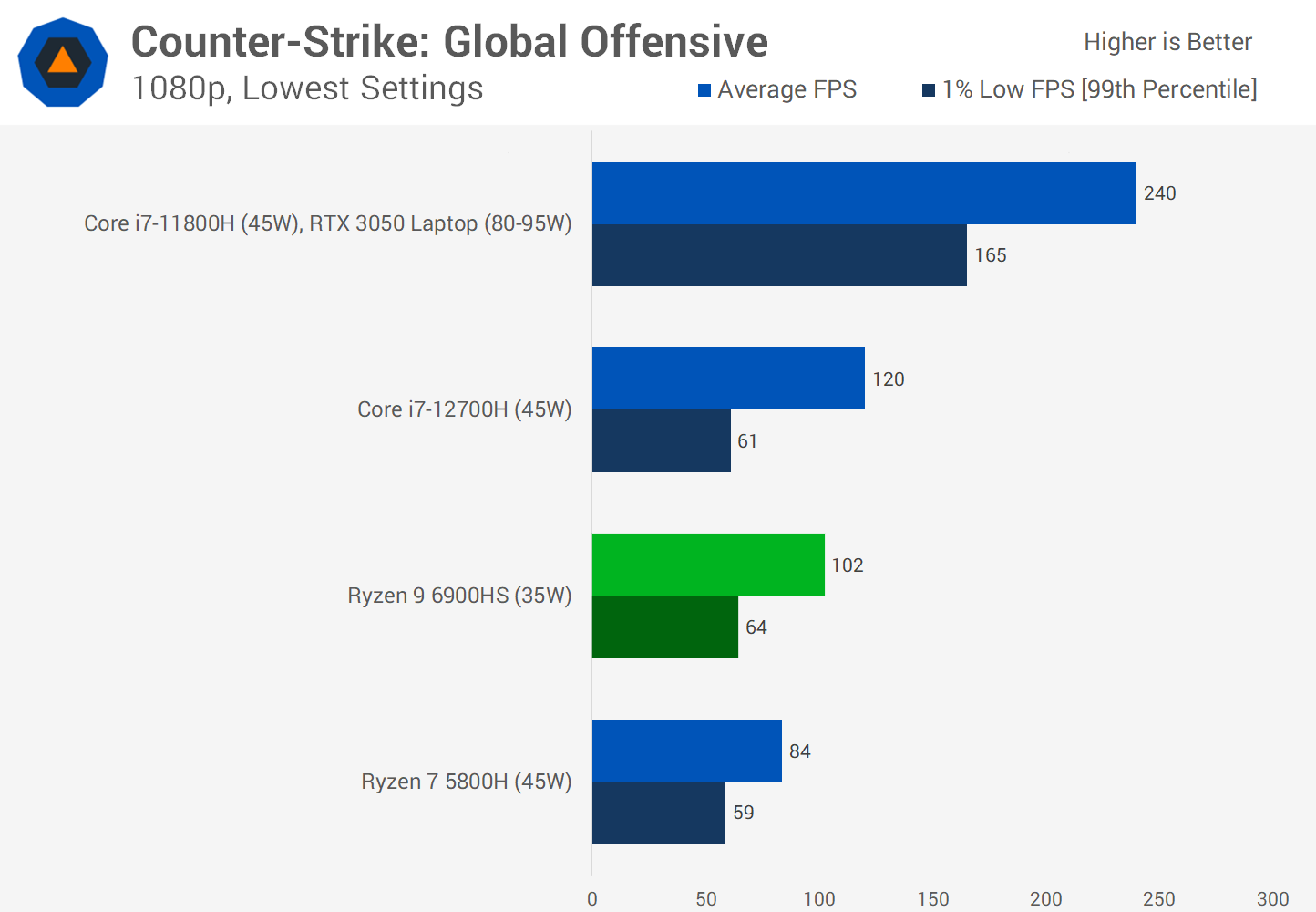 However not every game is faster using a Ryzen iGPU. CS:GO was one case where the 12700H was superior to the tune of 18 percent. Yes, the 6900HS is faster than the 5800H, but the margin was rather disappointing in this game and we suspect some CPU limitations are at play here, in addition to the low TDP level.