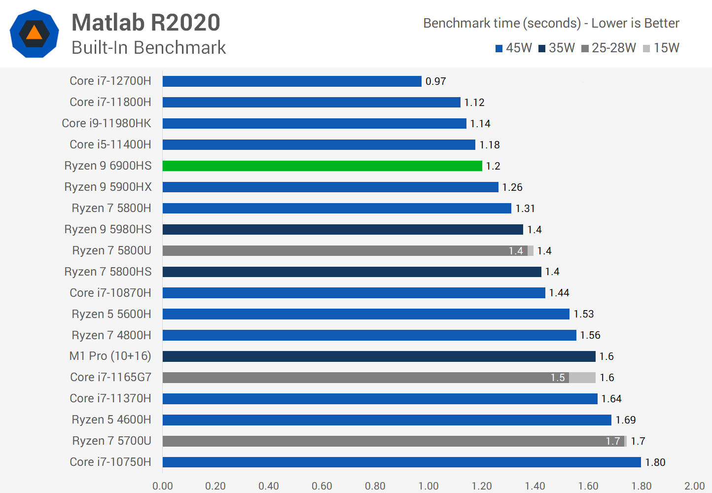 Matlab is another benchmark that benefits from improved memory bandwidth that we're getting this generation. However this is only able to bring AMD's 35W CPU up the chart from a mid-table position - it is 13% faster than the 5980HS and 5% faster than the 5900HX - but it still gets easily beaten by the Core i7-12700H and even some 11th-gen processors. AMD needs to deliver an IPC gain to retake the lead in this test.