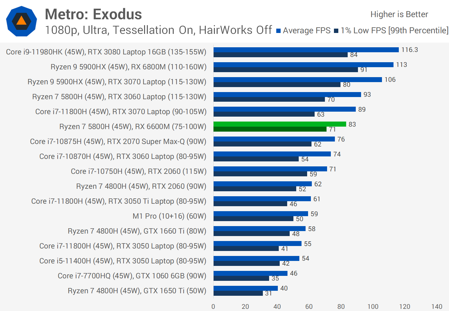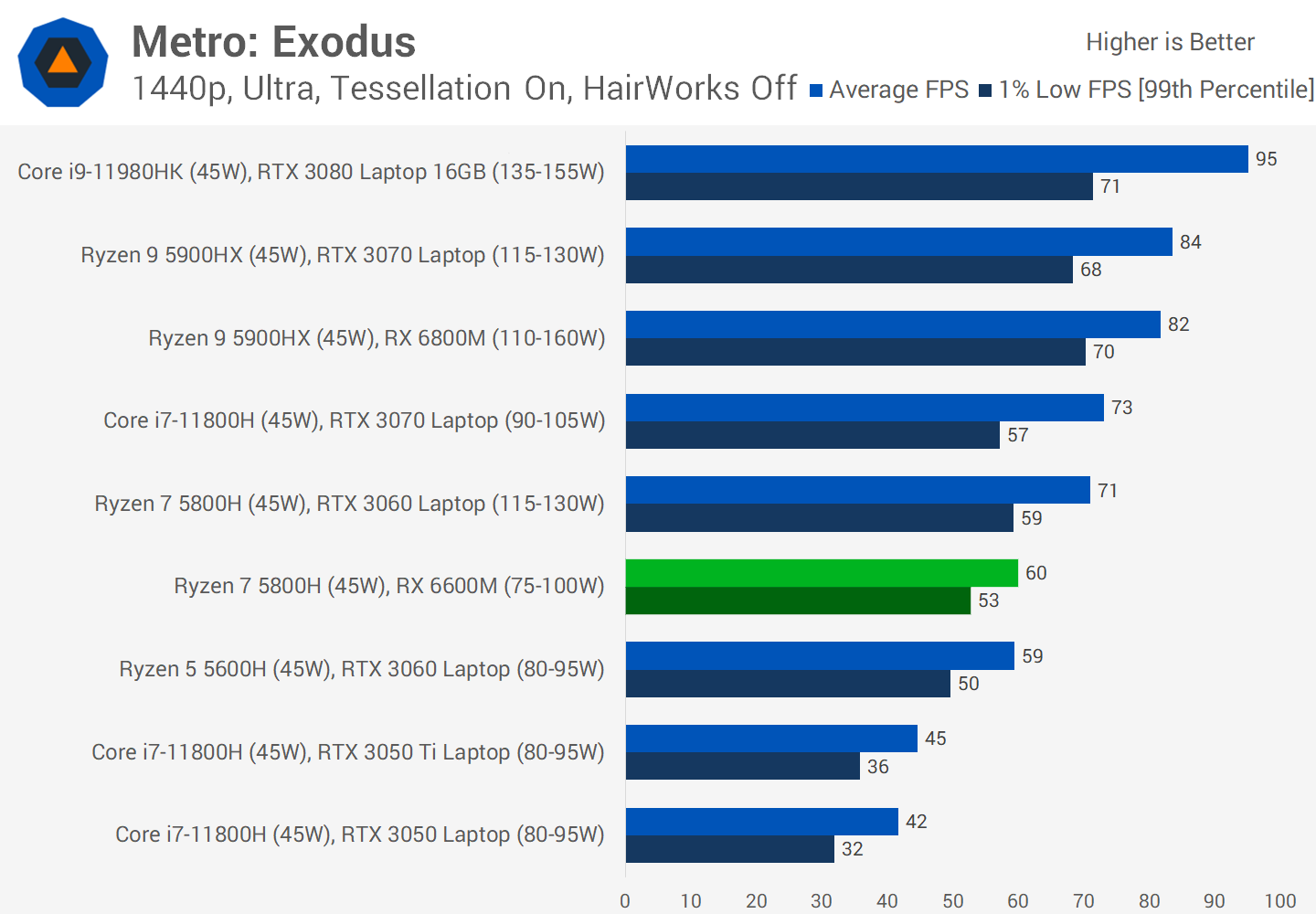 In Metro Exodus at 1080p using ultra settings, the 6600M delivers performance between the two RTX 3060 variants we have in our charts. The 6600M at up to 100W is 13 percent faster than the RTX 3060 running at 80-95W, but 10 percent slower than the same Nvidia GPU at 115-130W, so this is roughly where you'd expect based on the power limits. AMD's power target is between these two configurations, and so is performance. However the 6600M is clearly not a lower-tier or mainstream GPU, comfortably outperforming the RTX 2060, and delivering significantly more performance than the RTX 3050 Ti Laptop GPU.