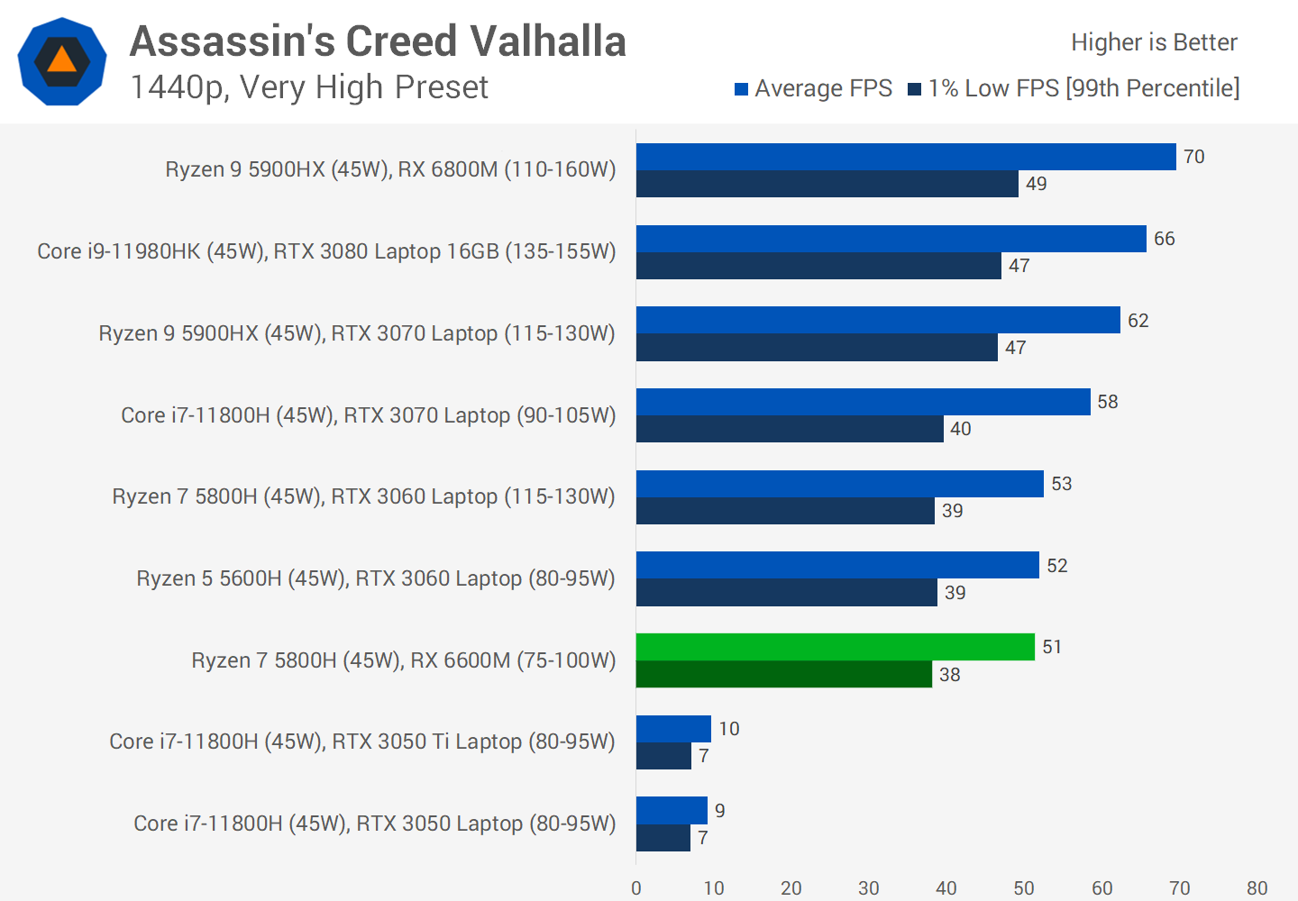 We've just seen two games where the 6600M fails to beat the best RTX 3060 laptop configuration, but that's not always the case. In Assassin's Creed Valhalla at 1080p, the RX 6600M is almost at the level of the RTX 3070, beating the 115W RTX 3060 by 11%, and beating the 80W variant by 18 percent. This title generally performs very well on AMD GPUs and that's no different here, especially at 1080p.