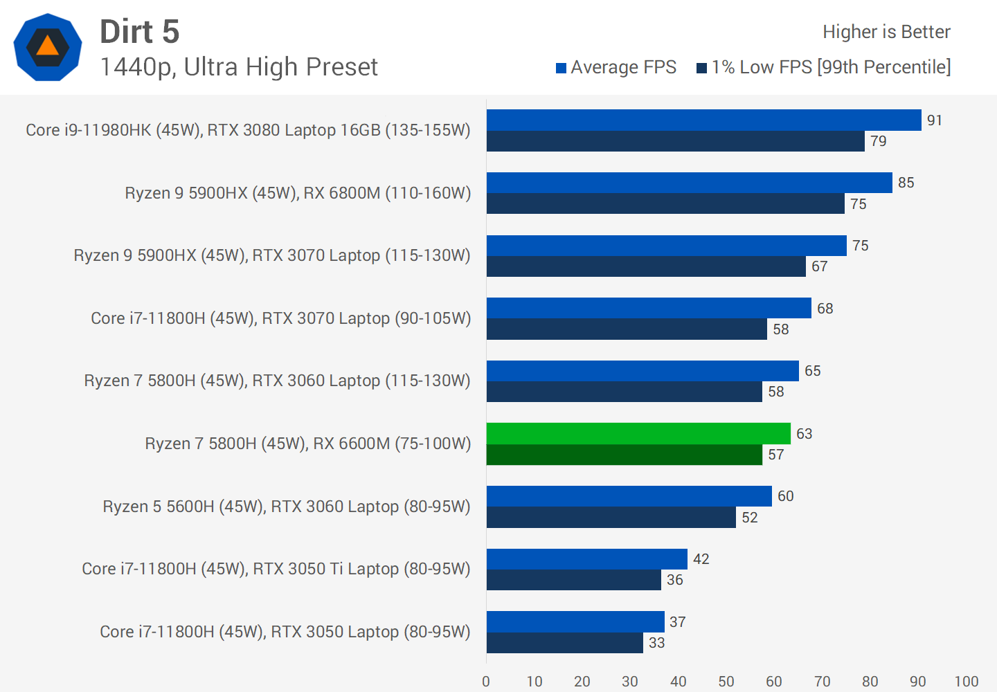 The final game we're looking at today in detail is Dirt 5. Here the 6600M is 8 percent faster than the full power RTX 3060 configuration at 1080p, and a substantial 24 percent faster than the lower power 80-95W model. The 6600M is much more in the ballpark of the RTX 3070 here, sitting between the two power configurations I've tested in this chart.