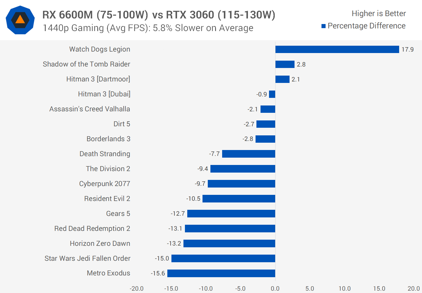 However at 1440p, the 6600M falls away, so if you're looking at a laptop with a higher resolution display or plan on using an external display, the full power RTX 3060 Laptop GPU is a faster and better choice. At this resolution, the 6600M is more in the ballpark of an 80-95W RTX 3060 configuration, so the 6600M also loses its edge in efficiency.