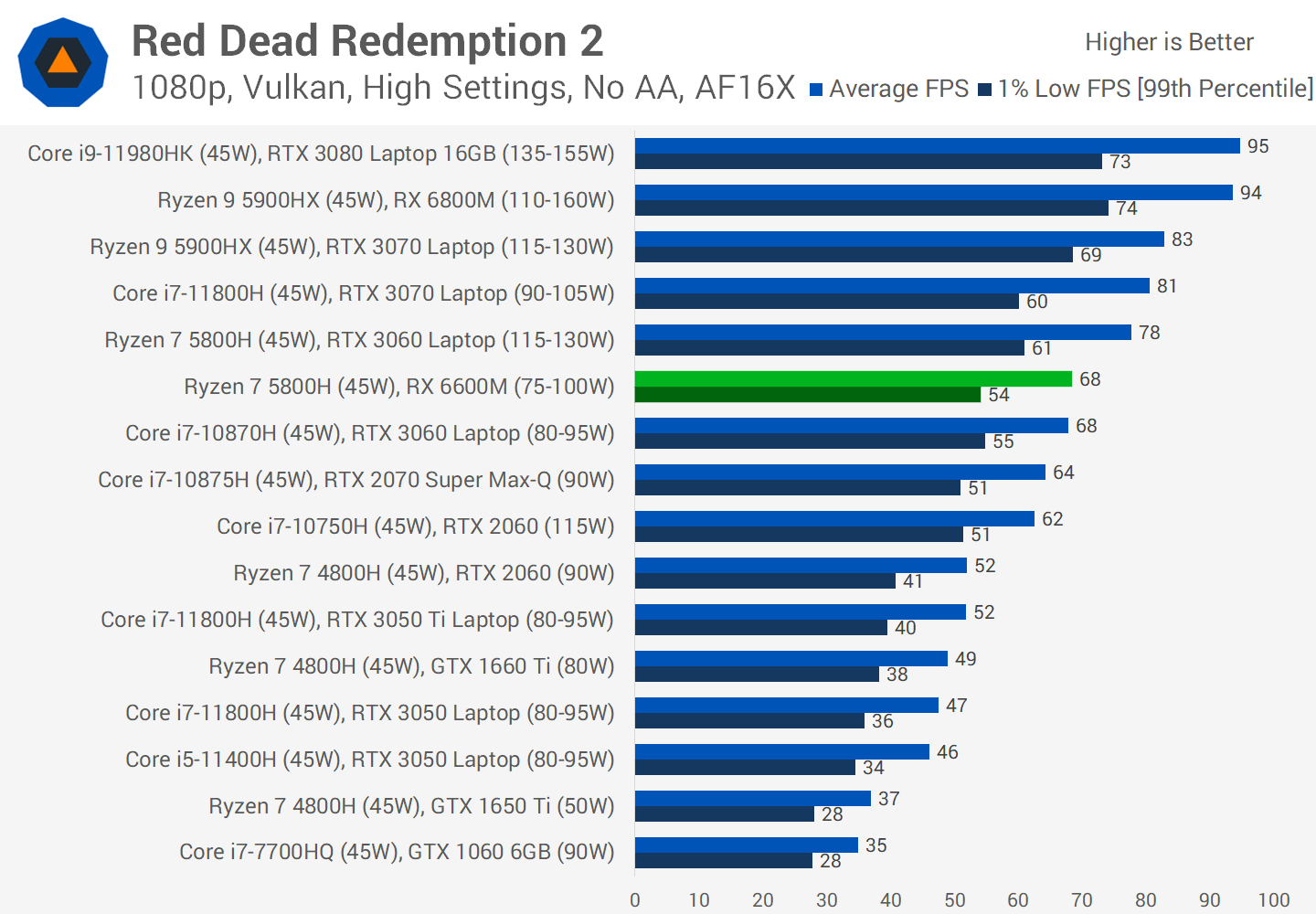In Red Dead Redemption 2, the 6600M struggles a little compared to the RTX 3060. In this title at 1080p, the 6600M is only able to match the lower-power RTX 3060 laptop configuration, and ends up 12 percent behind the maximum the RTX 3060 has to offer. This game really benefits from higher GPU power limits and the performance that can bring.