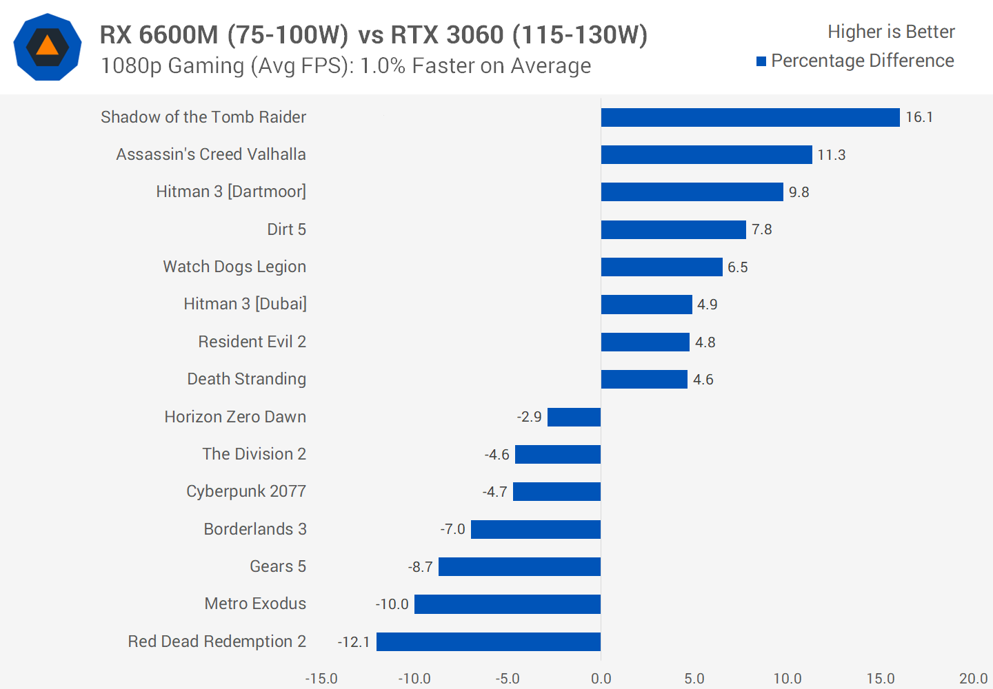 From those 8 games we get a pretty good look at how performance stacks up, but let's take a look across the full 16 game test sample. When comparing best configuration to best configuration at their full power limits, the RX 6600M is pretty similar to the RTX 3060 115W at 1080p. There's not much separating the average result, with a couple of strong titles for AMD, a couple for Nvidia, and many with just a single digit margin. Given the 6600M is running at a lower GPU power level, that's a decent result for AMD.