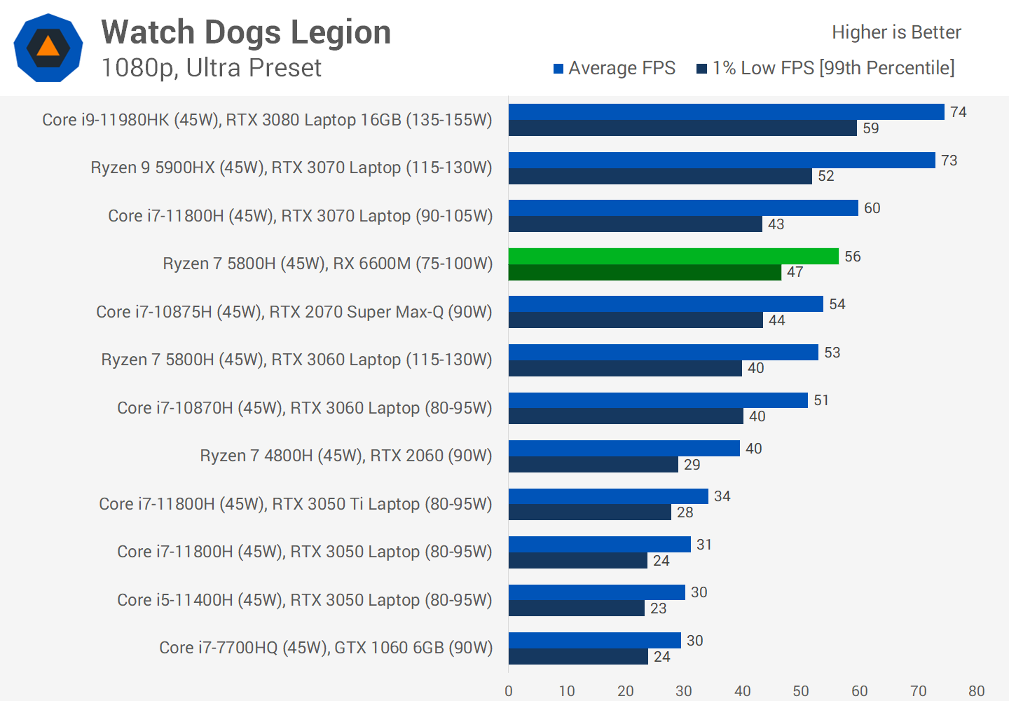 Watch Dogs Legion is a strong title for this AMD GPU configuration, delivering performance 7 percent faster than the RTX 3060 at 115W, and a decent 10 percent faster than the lower power variant. The 6600M is not at the level of the RTX 3070 yet, but it's sitting between the RTX 3060 and RTX 3070 which is a pretty decent result for what is ultimately a more mid-range GPU found in affordable gaming laptops.