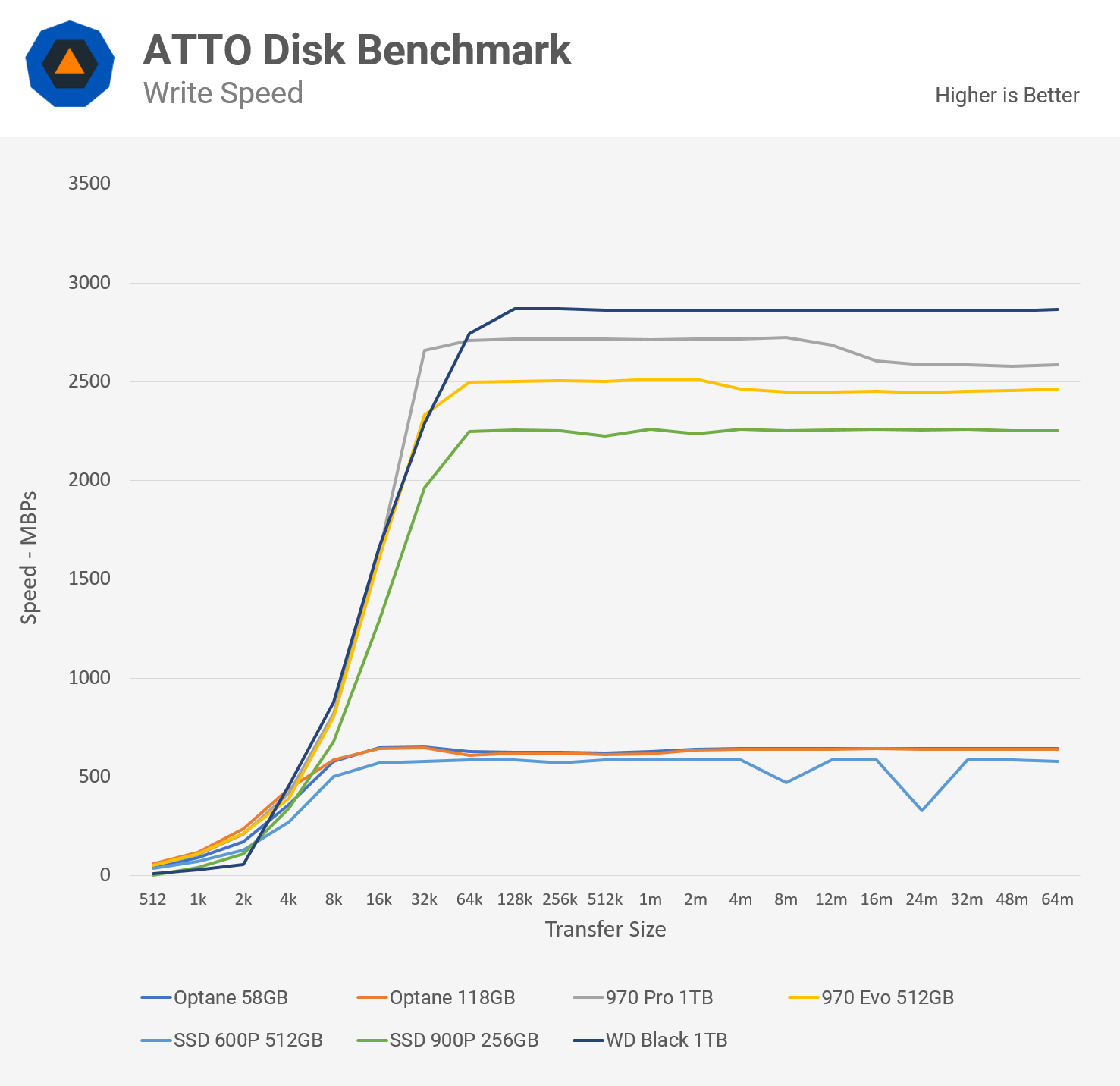 The first test I ran was ATTO Disk Benchmark. This gives a good idea of how each drive performs with various files increasing in size from 512 bytes up to 64MB. Small files are harder to process since there is more overhead for the controller. We can see that the Optane based drives generally reach their peak read speeds around 16-32k, sooner than the NAND based ones. These are all considered top-of-the-line SSDs and we can see the wide range in their performance numbers.
