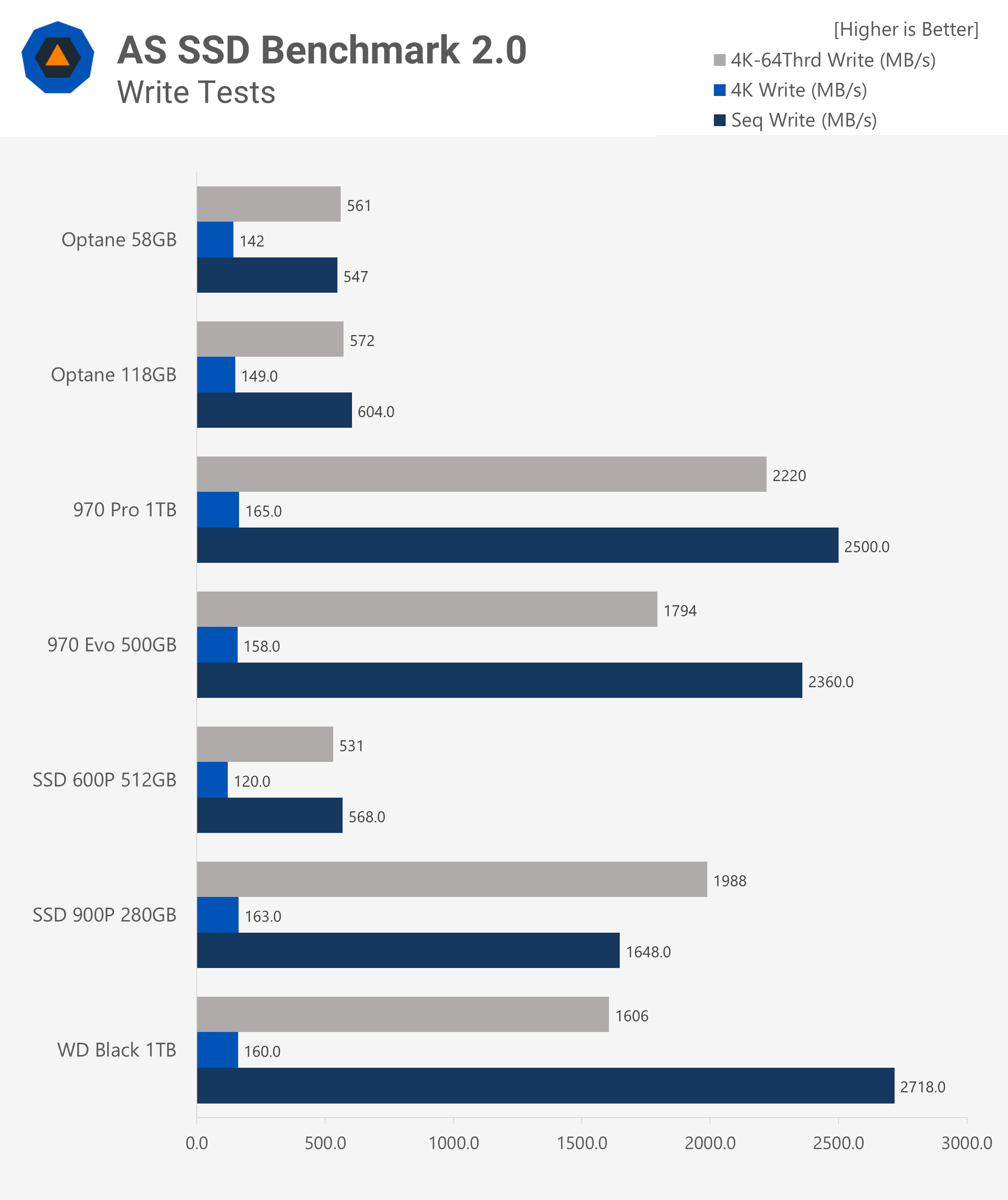 The 970 Pro just barely edges out the WD Black in the read test but can't sustain its rated 3500MB/s speed for long. The 970 Evo had some troubles here and despite being rated at 3400MB/s, only achieved a max of about 3150MB/s before tapering off substantially. The Optane 800P modules are spot on to their advertised numbers and the 900P is well above its rated 2500MB/s.