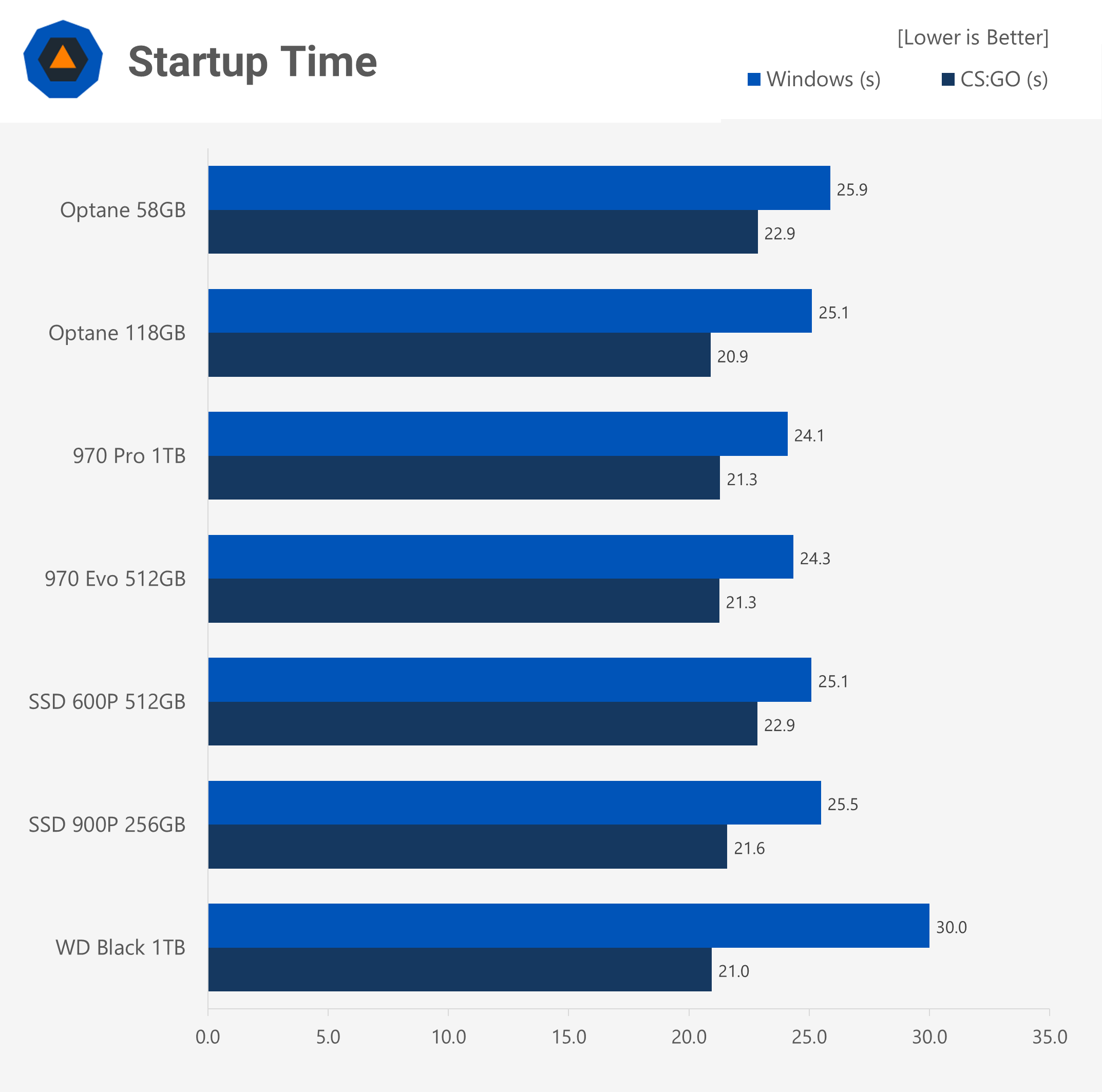The final test is very interesting from a mundane taks, day to day point of view. It shows the time for the computer to boot from completely off to the Windows desktop and then also the time to launch Counter-Strike: Global Offensive. For the most part both test results were within 2 seconds across the board...