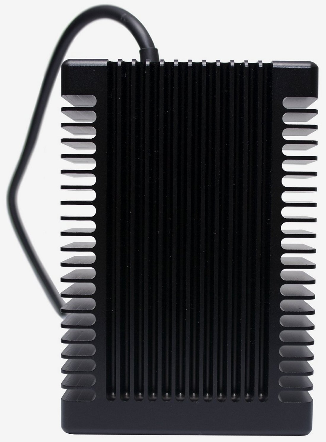 The enclosure is constructed entirely from aluminum, and sports an external fin design to aid passive cooling. All told, it weighs 12.25 ounces (0.7 lbs) and measures 2.8" W x 4.1" D x 1.25" H (70 x 103.2 x 31.5 mm). So it's not exactly huge, but it's not particularly small either.