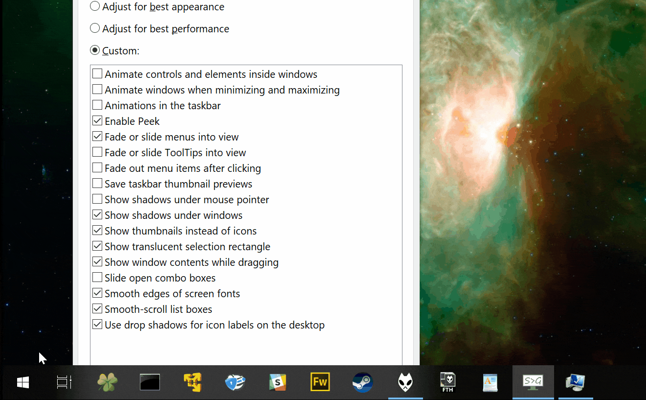 Disabling animations for menus and windows can improve performance on lower-end machines and Windows is visually snappier without these settings enabled. We've included a gif demonstrating the speed difference of opening and closing OpenShell with and without one of these performance animation settings enabled ("Fade or slide menus into view").