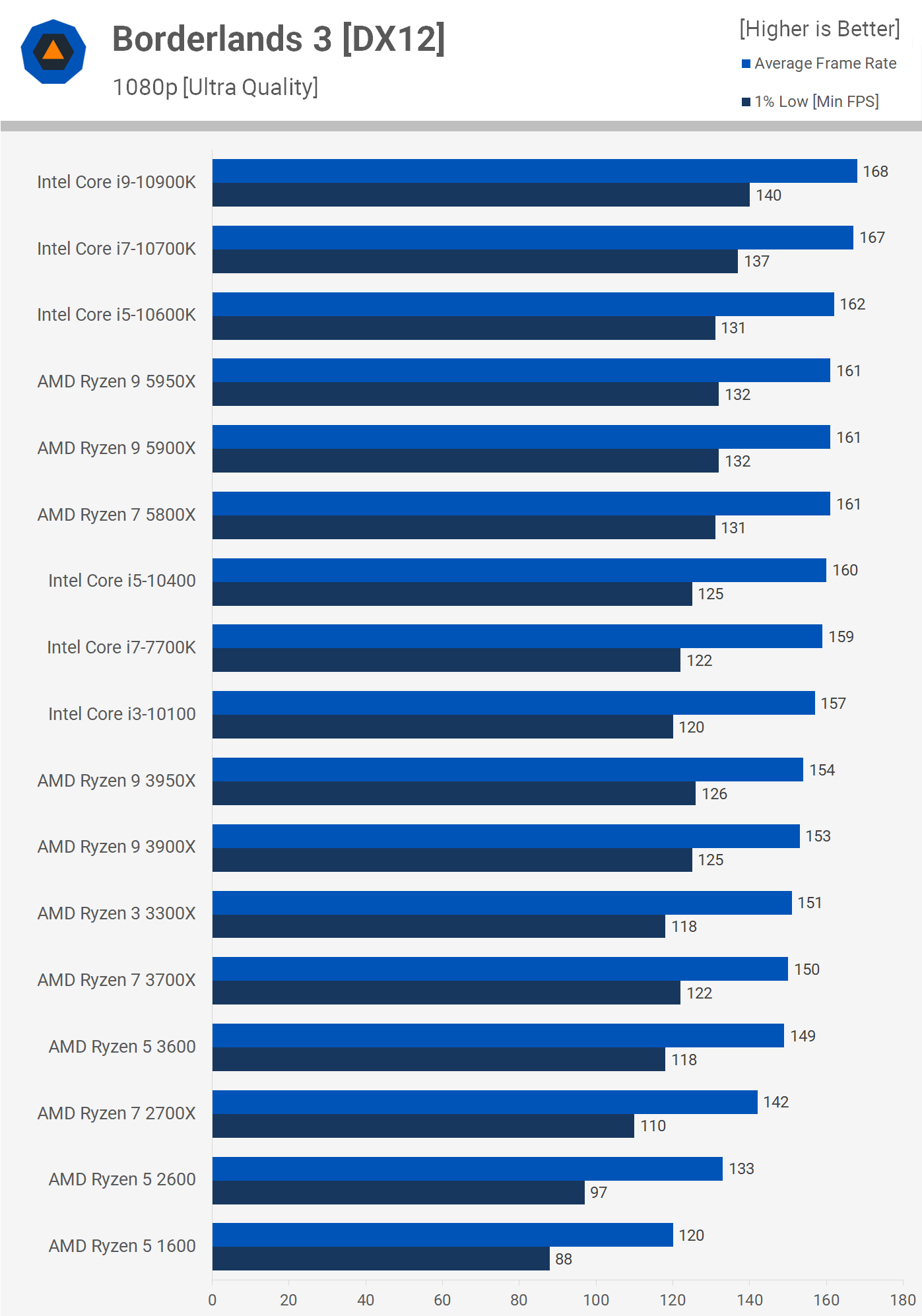 The gains seen in Borderlands 3 are less impressive, here the 5800X was 7% faster than the 3700x and that meant it was a little slower than competing Intel parts. It was just 4% slower than the 10700K though, which we'd generally deem a tie.