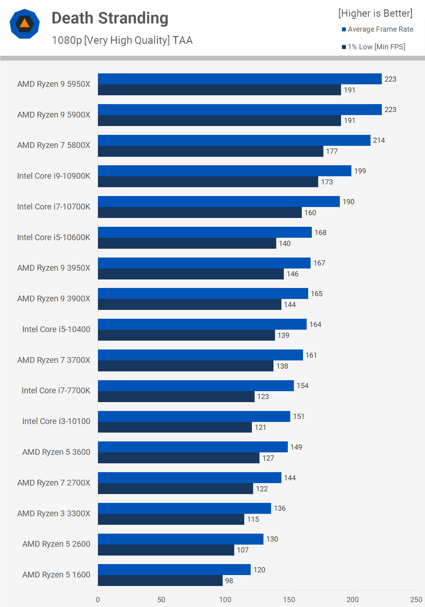 Where we don't see a tie is in Death Stranding, here the 5800X was 12% faster than the 10700K and you'd be hard pressed to make up that margin by overclocking the Core i7 part. The 5800X is also 33% faster than the 3700X which is great, though having now looked at the 5900X and 5950X, we're starting to get spoiled to seeing margins like this.
