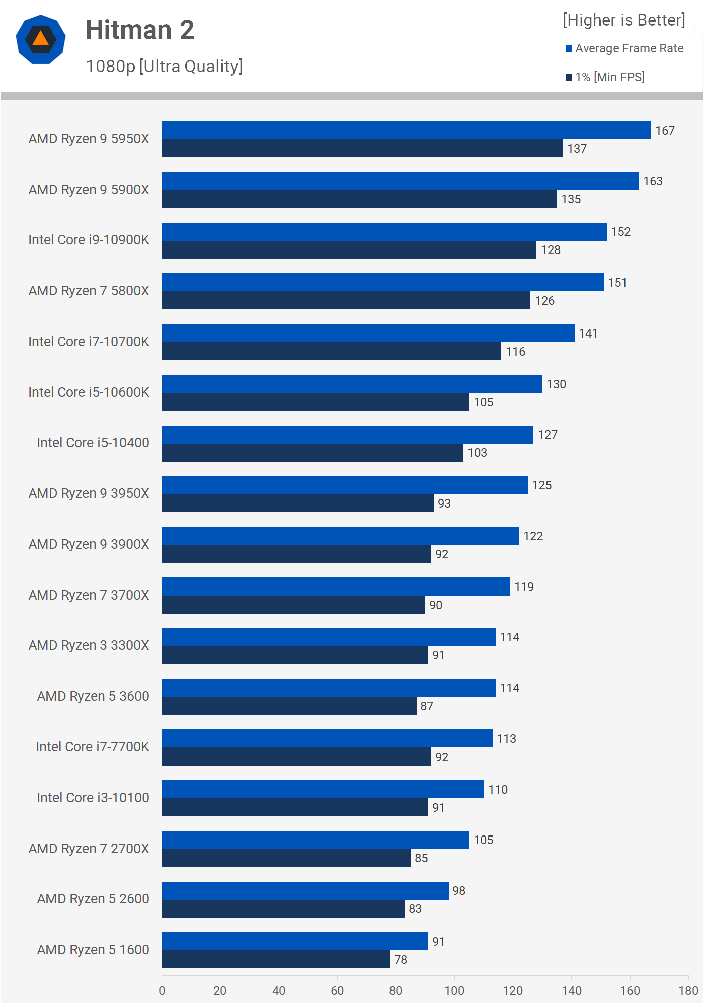 Interestingly, the 5800X isn't as impressive as the 5900X and 5950X in Hitman 2, pushing the RTX 3090 to 151 fps at 1080p, placing it on par with the 10900K. Certainly not a bad result but we also weren't expecting it to be 7% slower than the 5900X.