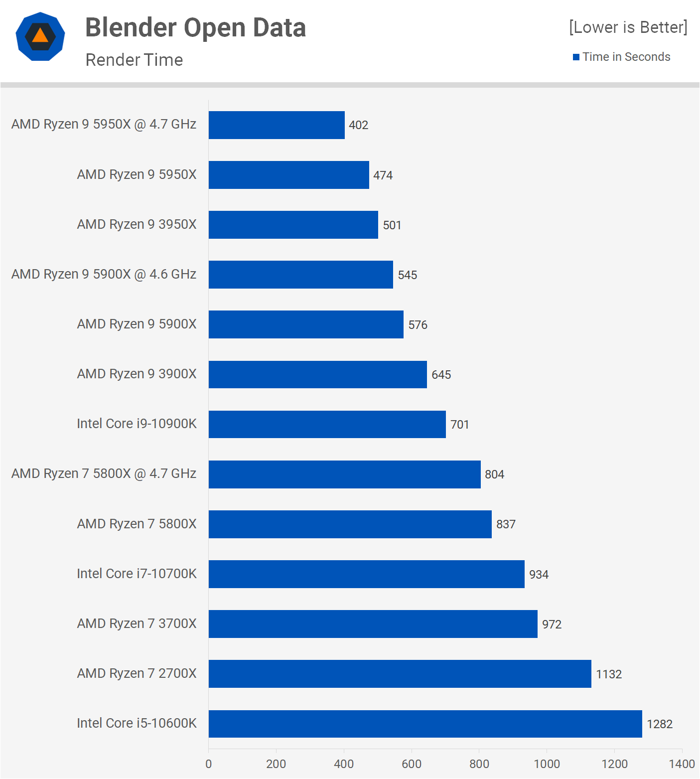 We're looking at a 16% performance uplift over the 3700X in Blender making the 5800X 12% faster than the Core i7-10700K. It was also 16% slower than the 10900K and 31% slower than the 5900X, which makes sense given it packs 33% fewer cores.