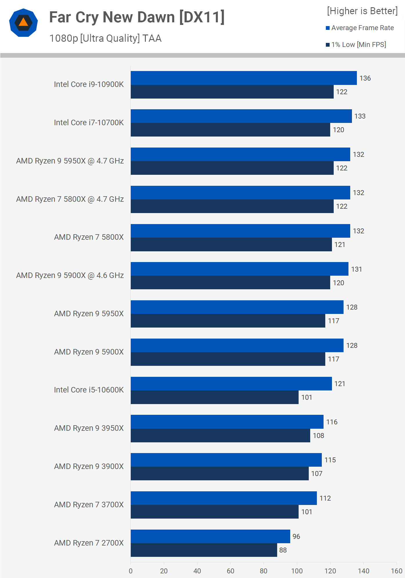 For our gaming tests we used Nvidia's RTX 3090. Checking out Far Cry New Dawn first, we find that in this latency-sensitive title the 5800X is a whisker faster than the 5900X and 5950X, basically it matched the 10700K making it just 3% slower than the 10900K.