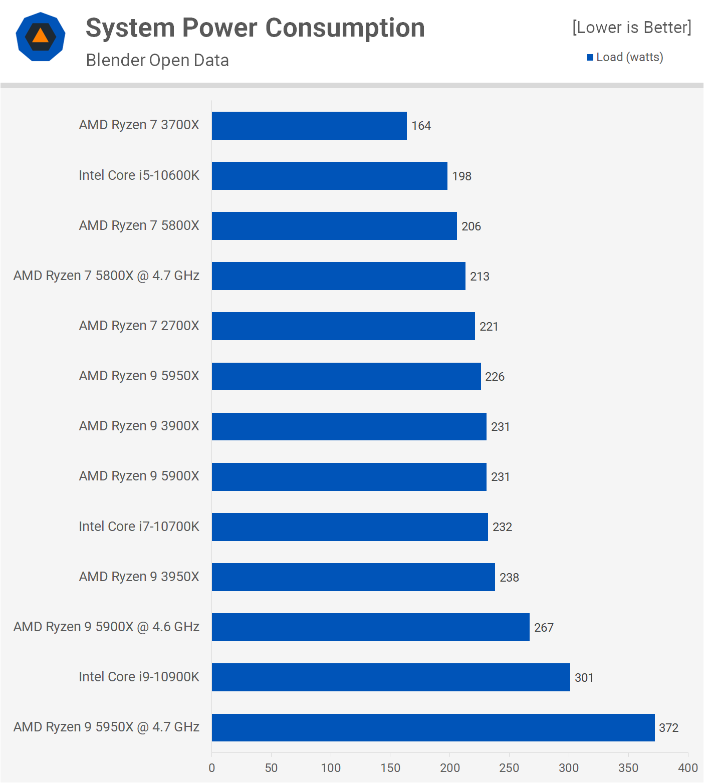 It's also worth noting that the 5800X was 16% faster than the 3700X in this test, so a 13% increase in total system power is still very good in terms of efficiency. It's also 30 watts less than Intel's 10700K.